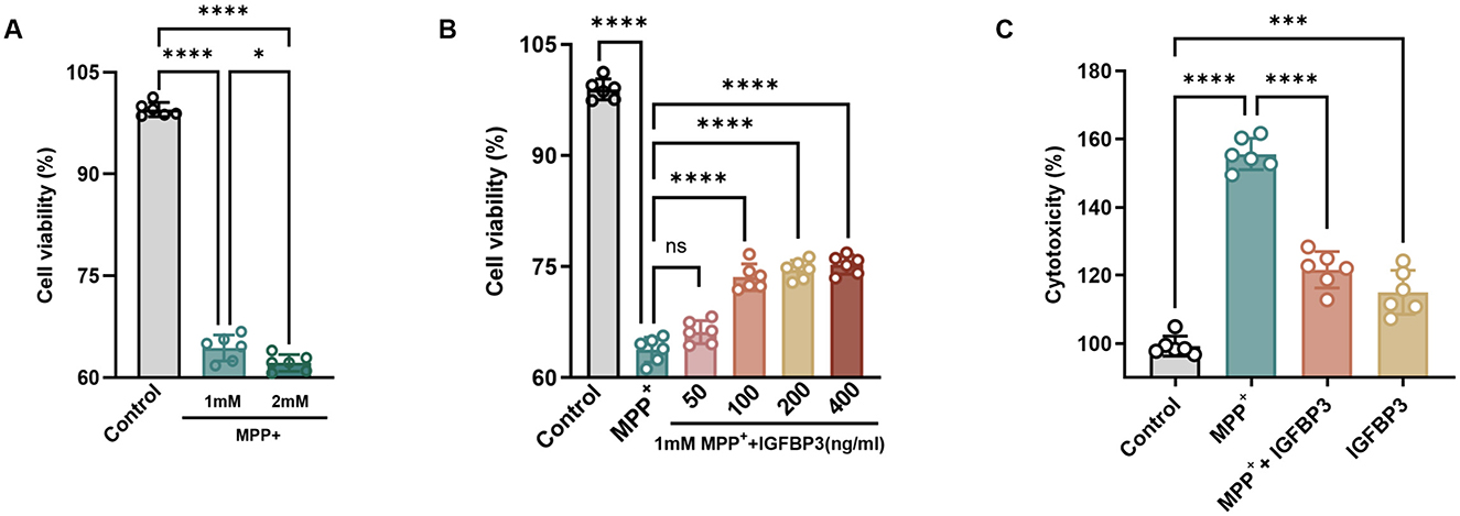 Figure 3. IGFBP3 Attenuates MPP+-induced viability and cytotoxicity in SH-SY5Y cells. (A) Effects of MPP+ at different concentrations on SH-SY5Y cell viability detected by CCK-8 assay (n = 6). (B) Effects of IGFBP3 at different concentrations on SH-SY5Y cell viability detected by CCK-8 assay (n = 6). (C) Cytotoxicity of 100 ng/mL IGFBP3 treatment and 1 mM MPP+-introduced in SH-SY5Y cells in each group was determined by LDH assay (n = 6). Columns with error bars present the mean ± SEM. one-way ANOVA with Tukey's post hoc tests (A–C) nsp > 0.05, *p < 0.05, ***p < 0.001, and ****p < 0.001.