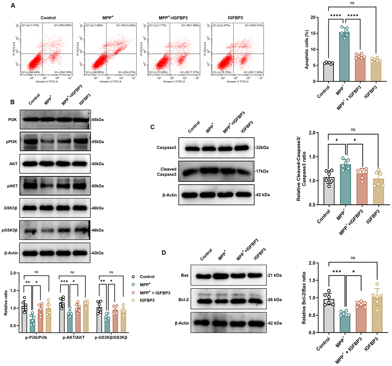 Figure 4. IGFBP3 inhibited MPP+-induced apoptosis and activated the PI3K/Akt/GSK3β pathway in SH-SY5Y cells. (A) Flow cytometry results of cell apoptosis in SH-SY5Y cells (n = 6). (B) Western blot and quantitative analysis of phosphorylation/total protein ratio of PI3K/AKT/GSK3β in SH-SY5Y cells (n = 6). (C, D) Western blot and quantitative analysis of cleaned-caspase3, caspase3, Bcl-2 and Bax in SH-SY5Y cells (n = 6). Columns with error bars present the mean ± SEM. one-way ANOVA with Tukey's post hoc tests (Flow cytometry, Bcl-2/Bax ratio, pAKT/AKT ratio, pGSK3β/GSK3β ratio). Welch's ANOVA with Tamhane's T2 post hoc tests (Cleaved-Caspase3/Caspase3 ratio, pPi3k/Pi3k ratio). ns p > 0.05, *p < 0.05, **p < 0.01, ***p < 0.001, and ****p < 0.001.