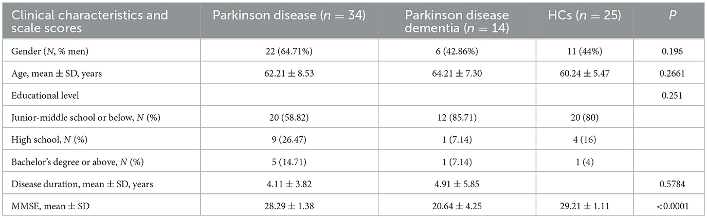 The study cohort comprised 73 participants: 34 with PD, 14 with PDD, and 25 HCs. The mean age was comparable across all groups (PD: 62.21 ± 8.53 years; PDD: 64.21 ± 7.30 years; HCs: 60.24 ± 5.47 years). Disease duration was longer in the PDD group than that in the PD group (4.91±5.85 vs. 4.11±3.82 years). A statistically significant difference in MMSE scores was observed among the three groups (PD: 28.29 ± 1.38; PDD: 20.64 ± 4.25; HCs: 29.21 ± 1.11, p < 0.0001). In addition, there was no statistically significant difference in age, gender, or education level among the three groups (Table 1).
