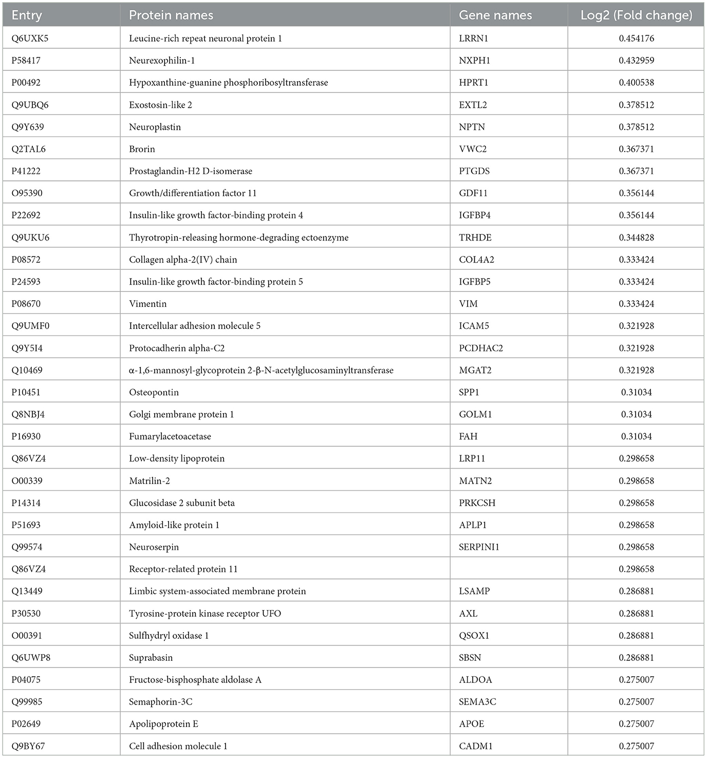 Proteomic methodologies have matured into powerful tools for biomarker discovery (Rozanova et al., 2021). Among these, the isobaric tags for relative and absolute quantification (iTRAQ) technique is widely employed as a high-throughput assay for identifying protein biomarkers (Wen et al., 2014). In this study, we utilized an iTRAQ-based approach to profile differences in the cerebrospinal fluid (CSF) proteome between PD patients with and without dementia. Subsequent bioinformatics analysis and in vitro functional validation were performed to provide a theoretical foundation for the screening and clinical application of PDD CSF biomarkers.