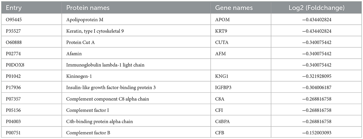 After converting the raw mass spectrometry data into an mgf format file through Proteome Discoverer (ThermoFisher Scientific, USA), the corresponding protein sequence database was searched and identified using protein identification software Mascot 2.3.02(Matrix Science Ltd, UK). At the same time as quality control analysis, determine whether the data in this case was qualified. After passing a certain screening threshold after the data was qualified, the final reliable protein identification result was obtained. Subsequently, iTRAQ quantitative analysis was performed, and CSF samples from PD, PDD, and HCs groups were labeled as groups A, B, and C, respectively. One repeated experiment was conducted, and a total of 8,85,123 secondary spectra were generated. Under the “1% FDR” filtering standard, a total of 7,987 peptide segments and 1,531 proteins were identified. In the case of repeated experiments, quantitative repeatability analysis was used to determine whether the quality of the quantitative data meets the standard. The significantly different proteins in a single experiment were screened under two conditions: fold change>1.2 and Q-value < 0.05. Then, intra group comparisons of PD, PDD, and HCs were conducted to identify PDD related differentially expressed proteins, including 34 upregulated proteins and 11 downregulated proteins (Tables 2, 3).