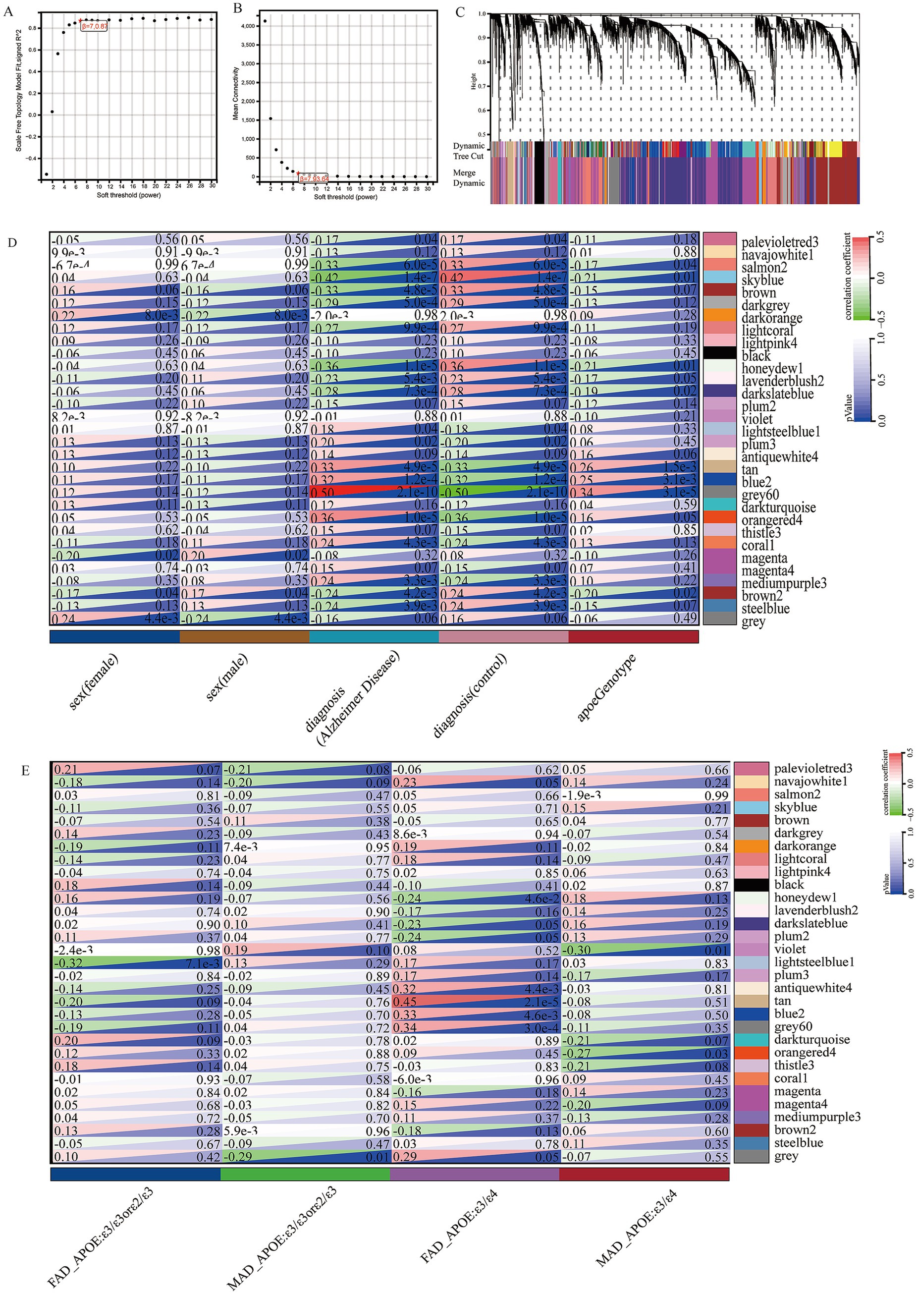 Figure 1. Construction of weighted gene co-expression networks. (A) Choosing the best soft-threshold power. (B) Analysis of the average connectivity of 1–30 soft threshold power. (C) Gene dendrogram and modules before and after merging. (D) Pearson correlation analysis of merged modules and sex, diagnosis and APOE genotype. (E) Pearson correlation analysis of merged modules and FAD_APOE (ε3/ε3 or ε2/ε3), MAD_APOE (ε3/ε3 or ε2/ε3), FAD_APOE (ε3/ε4), and MAD_APOE (ε3/ε4).