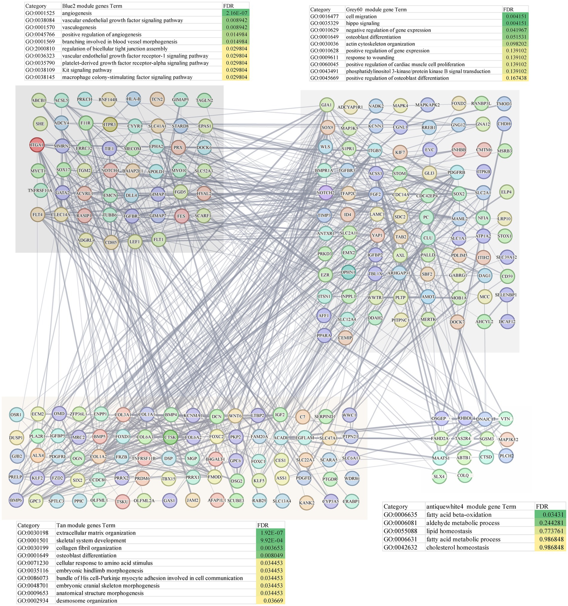 WGCNA was applied to construct a scale-free co-expression network using RNA-seq data from 277 temporal cortex samples in the Mayo cohort. The soft-threshold power in this research was calibrated to 7 (scale-free R2 = 0.87; Figures 1A,B), resulting in the identification of 31 co-expression modules and dendrogram clearly shows that the four key female-specific modules (antiquewhite4, tan, blue2 and grey60) reside on distinct branches (Figure 1C; Supplementary Table S1). Among these, four modules (tan, blue2, grey60 and orangered4) showed significant positive correlations with AD pathology (correlation coefficient > 0.3, p < 0.01), while four modules (salmon2, skyblue, brown and honeydew1) exhibited significant negative correlations (Figure 1D). Notably, we found that the tan, blue2 and grey60 modules positively correlated with the APOE genotype associated with AD susceptibility (risk rank: ε4 > ε3 > ε2) (Lanfranco et al., 2020). To further explore the cross-relationship between gene modules—APOE ε4 and sex, we constructed correlation heatmap between four phenotypes and gene modules: FAD_APOE:ε3/ε3 or ε2/ε3 (female AD patient with APOE ε3/ε3 or ε2/ε3 genotype), MAD_APOE:ε3/ε3 or ε2/ε3 (male AD patient with APOE ε3/ε3 or ε2/ε3 genotype), FAD_APOE:ε3/ε4 (female AD patient with APOE ε3/ε4 genotype), and MAD _APOE:ε3/ε4 (male AD patient with APOE ε3/ε4 genotype) (Figure 1E). Strikingly, modules antiquewhite4, tan, blue2 and grey60 correlated exclusively with the female AD patient carrying APOE ε4, however there was no significant correlation with the phenotypes of the other sex/APOE genotype combinations. This finding aligns with the elevated AD risk conferred by APOE ε4 and underscores the need to explore these modules’ biological functions to explain female-specific susceptibility. Through Gene Ontology Biological Process (GOBP) analysis, the blue2 gene module is mainly enriched in angiogenesis, vascular endothelial growth factor signaling pathway, angiogenesis and other signaling pathways, and the grey60 gene module is mainly enriched in biological processes such as cell migration, hippo signaling and negative regulation of gene expression. The tan gene module is mainly enriched in biological processes such as extracellular matrix production, skeletal system development and glial fiber production, and the antiquewhite4 gene module is mainly enriched in fatty acid β-oxidation, acetaldehyde metabolism processes and lipid homeostasis (Figure 2). Hub genes from clinically significant, female-specific APOE ε4-associated modules were identified using cutoffs of |MM| > 0.8 and |GS| > 0.1, yielding 315 high-connectivity hub genes (Figure 2; Supplementary Table S1). The protein–protein interaction (PPI) network for hub genes derived from the female-specific APOE ε4-associated modules is presented in Figure 2. Given the substantial overlap between the gene modules significantly associated with AD pathology (Figure 1D) and those specifically correlated with female APOE ε4 carriers (Figure 1E), subsequent analyses focused on the hub genes identified within the female-specific APOE ε4-associated modules (antiquewhite4, tan, blue2, grey60).