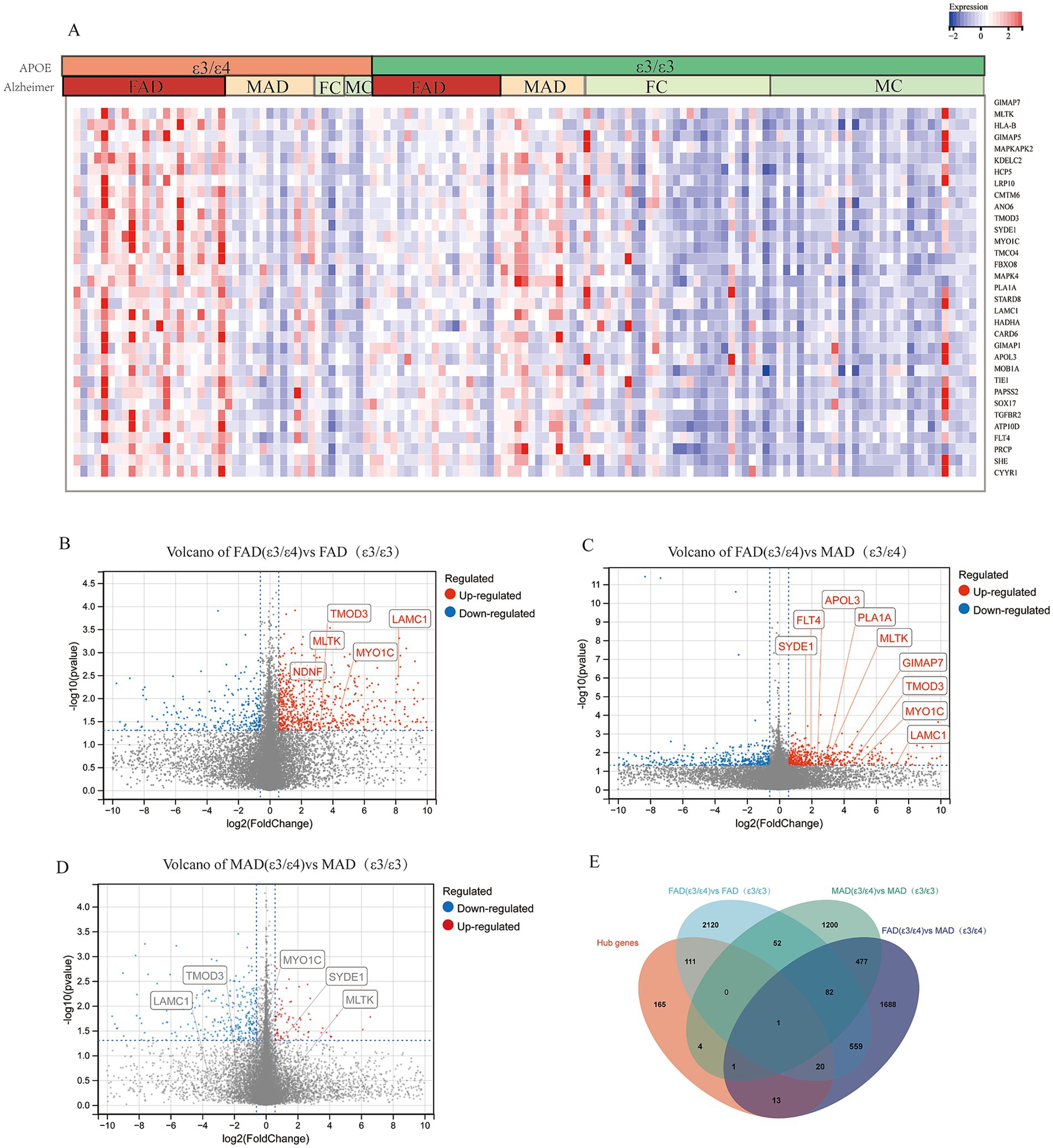 Figure 3. Hub genes from core modules were overexpressed in female AD patients with APOE ε3/ε4 in mayo cohort. (A) Heatmap of gene expression of representative hub genes, Female AD patients (FAD), Male AD patients (MAD), FC (Female Control), MC (Male Control). (B) Volcano plots illustrating the genes expression of FAD (APOE ε3/ε4) compared to FAD (APOE ε3/ε3). (C) Volcano plots illustrating the genes expression of FAD (APOE ε3/ε4) compared to MAD (APOE ε3/ε4). (D) Volcano plots illustrating the genes expression of MAD (APOE ε3/ε4) compared to MAD (APOE ε3/ε3). (E) Venn diagrams to show the numbers of DEGs identified in different groups of comparison: FAD (APOE ε3/ε4) versus MAD (APOE ε3/ε4); MAD (APOE ε3/ε4) versus MAD (APOE ε3/ε3); FAD (APOE ε3/ε4) versus FAD (APOE ε3/ε3).