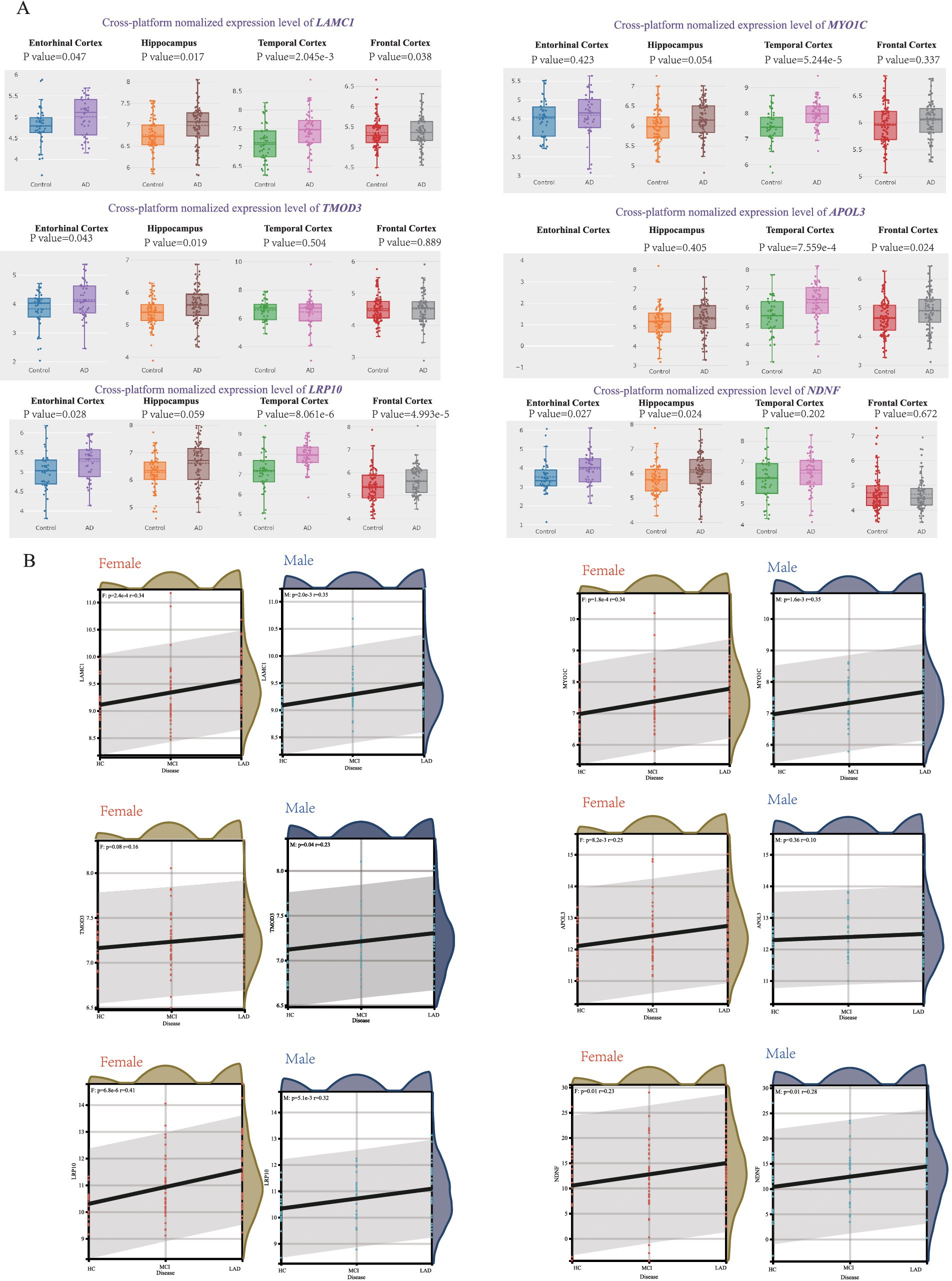 Figure 4. Correlation between hub genes and pathological status of AD. (A) AlzData database showing the expression levels of LAMC1, MYO1C, TMOD3, APOL3, LRP10 and NDNF in AD patient and control group. (B) The correlation between female/male AD pathology and LAMC1, MYO1C, TMOD3, APOL3, LRP10, NDNF expression in MSBB cohort.