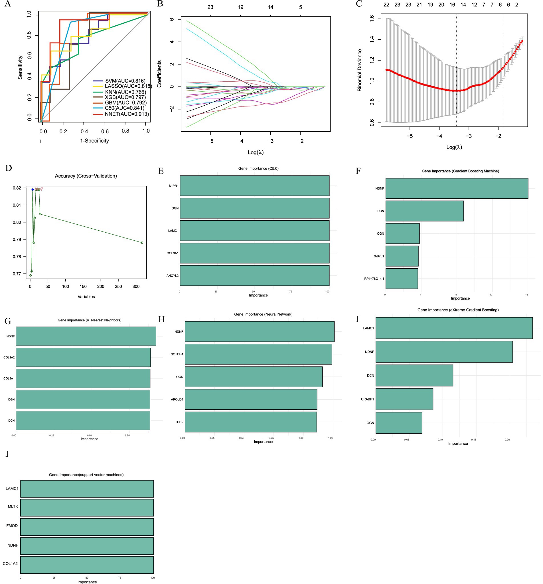 Figure 5. Machine learning to identify diagnostic genes of female AD patients with APOE ε3/ε4. (A) ROC curves from seven models. (B) LASSO coefficient profiles of candidate genes. (C). Cross-validation to select the optimal tuning parameter log (Lambda) in LASSO regression analysis. (D) SVM Recursive Elimination Validation. (E) Top five important trait genes of C5.0. (F) Top five important trait genes of GBM. (G) Top five important trait genes of KNN. (H) Top five important trait genes of NNET. (I) Top five important trait genes of XGB. (J) Top five important trait genes of SVM.