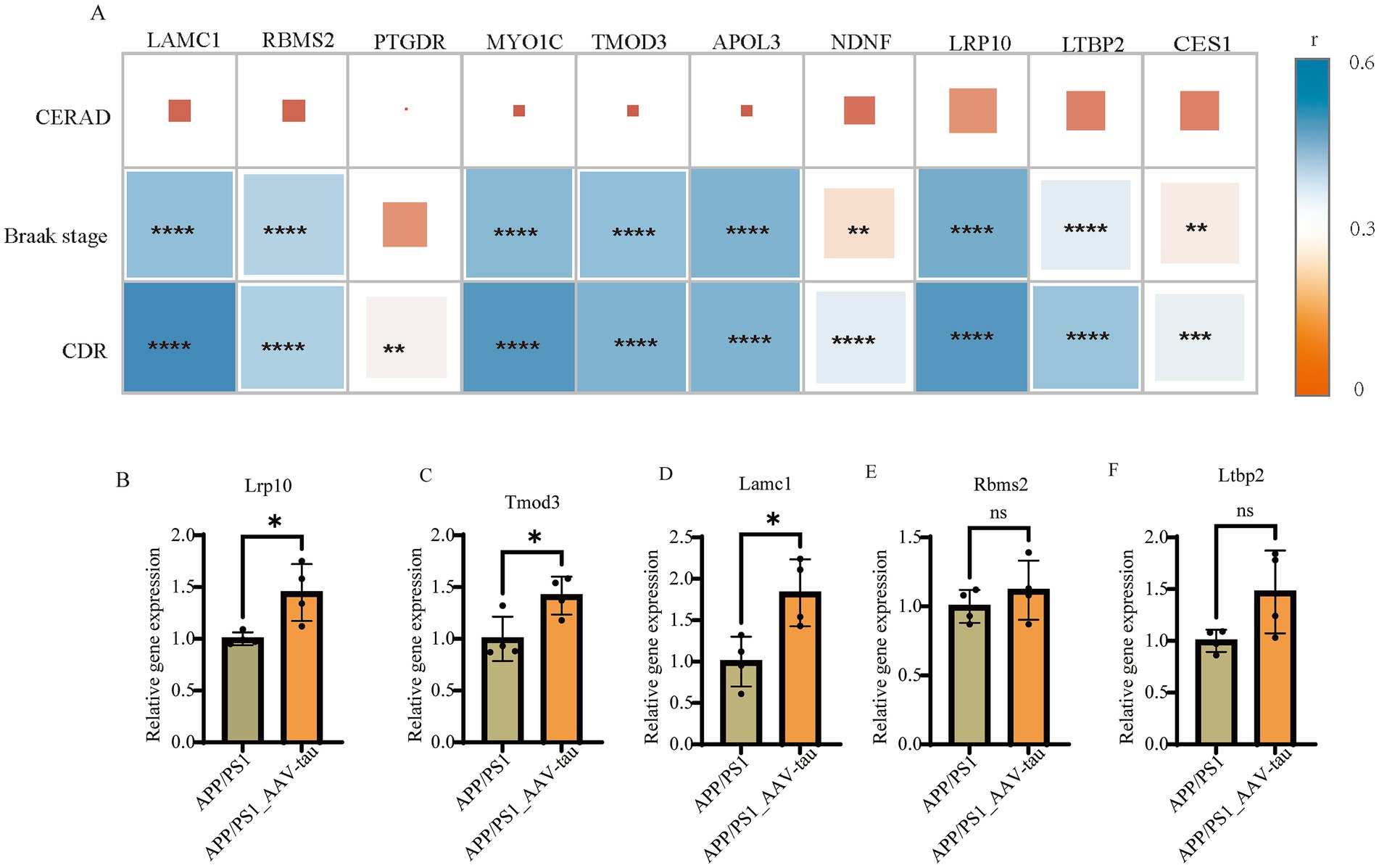 Figure 6. (A) Correlation analysis of gene expression with CERAD scores, Braak stages, and CDR scores in MSBB cohort. (B–F) Relative mRNA levels of Lrp10, Tomd3, Lamc1, Rbms2 and Ltbp2 of brain cortex, n = 4. *For p < 0.05. “ns” for no significant difference.