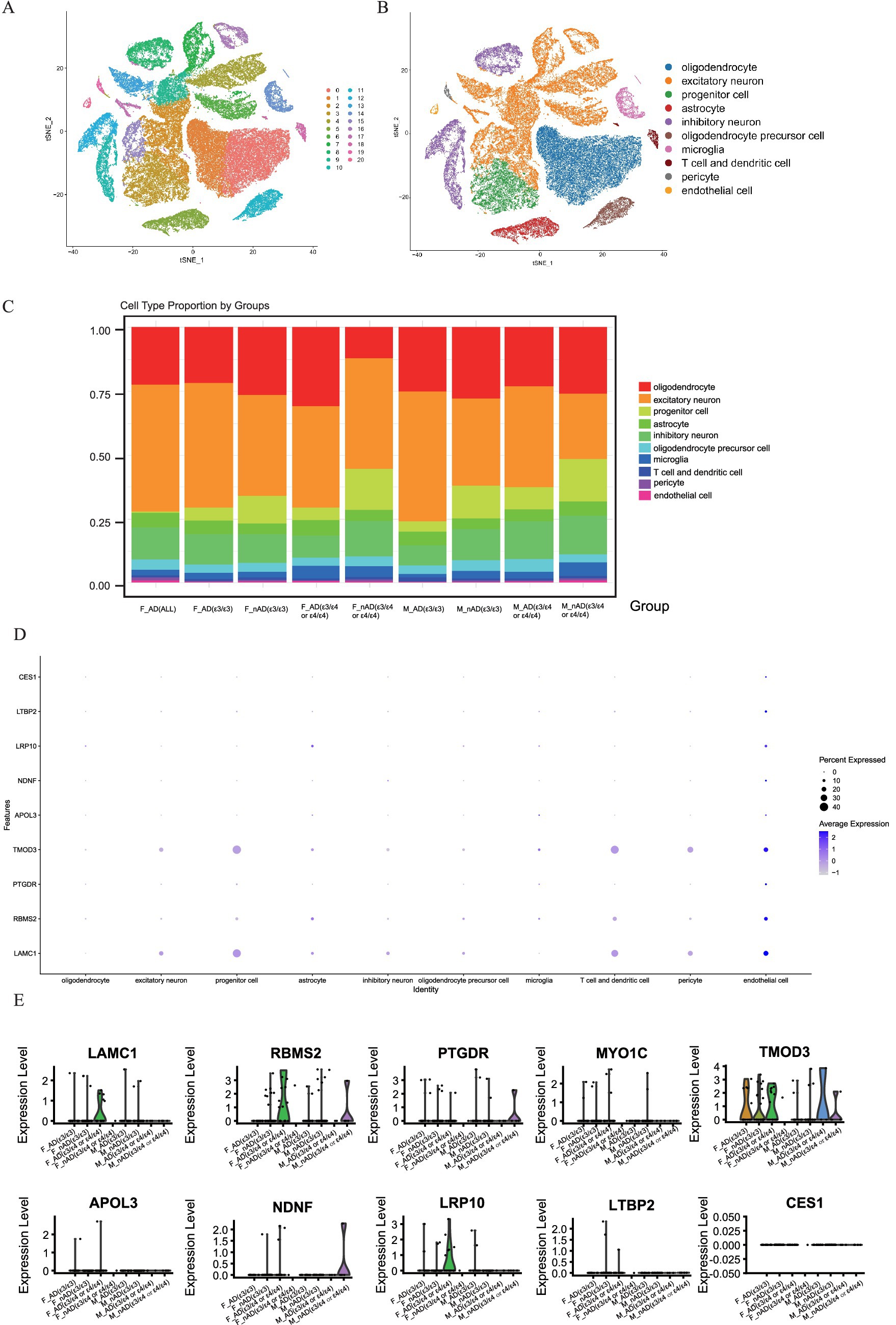 To investigate the potential role of hub genes within specific cell types, we analyzed the single-nucleus RNA-seq dataset (AMP-AD syn18485175) (Mathys et al., 2019). The t-SNE visualization robustly clustered major cell populations in the temporal cortex (Figure 7A), with clusters annotated using the CellMarker database (Figure 7B). We found that there were significant differences in the proportions of various cell types among samples with different disease states, genders, and apolipoprotein E (APOE) genotypes. Notably, the proportion of progenitor cell significantly decreases in all AD samples compared to no AD pathology samples, and we discovered that the proportion of oligodendrocyte in F_nAD (female with no AD pathology) (APOE ε3/ε4) was significantly lower than other groups (Figure 7C). Dot plots revealed broad expression of TMOD3, RBMS2 and LAMC1 expressed across progenitor cell, T cell and dendritic cell and endothelial cell (Figure 7D). Through violin plots, we found that in endothelial cells, the mRNA expression of LAMC1, RBMS2, MYO1C, TMOD3, APOL3, and LRP10 in the F_AD (female with AD pathology) (APOE ε3/ε4 or ε4/ε4) group was much higher than other groups. Combined with the information on expression levels, the overall trend was consistent with the results of Bulk RNA-seq (Figure 7E). However, no similar trend was observed in neural precursor cells, T cells and presenting cells (Supplementary Figure 7).