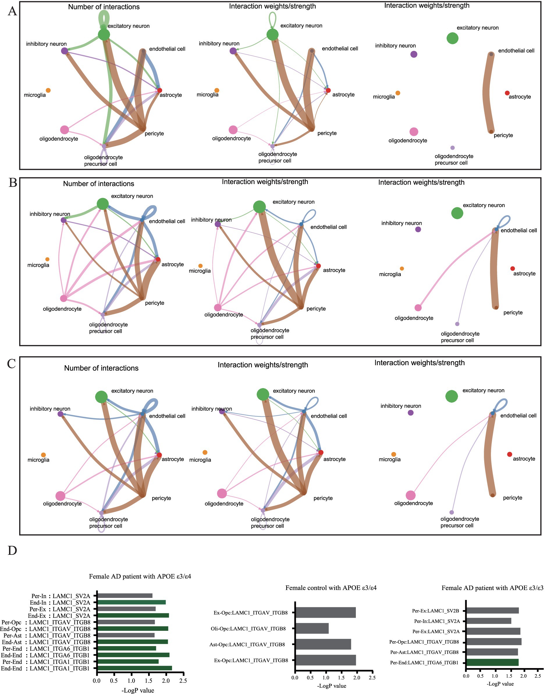 Analysis of intercellular signaling revealed distinct network patterns across cohorts, Non-AD APOE ε3/ε4 or ε4/ε4 females and APOE ε3/ε3 AD females exhibited balanced neuron-astrocyte-oligodendrocyte precursor communication networks; Conversely, APOE ε3/ε4 or ε4/ε4 female AD patients demonstrated three hallmark alterations: diminished neuron-to-glial signaling (Figures 8A,B), significantly enhanced endothelial communication, and elevated oligodendrocyte activity (Figures 8B,C). Extracellular matrix pathway interrogation specifically implicated endothelial Laminin B2 Chain (LAMC1)-ligand dysregulation in APOE ε4-carrying female AD patients (Figure 8D), where aberrant interactions with parenchymal ligands may disrupt endothelial homeostasis through integrin-mediated Mechan transduction pathways. These results establish a direct association between endothelial-specific gene dysregulation (particularly LAMC1), compromised neurovascular unit integrity, and tau pathology progression, highlighting actionable targets for precision interventions in this high-risk demographic.