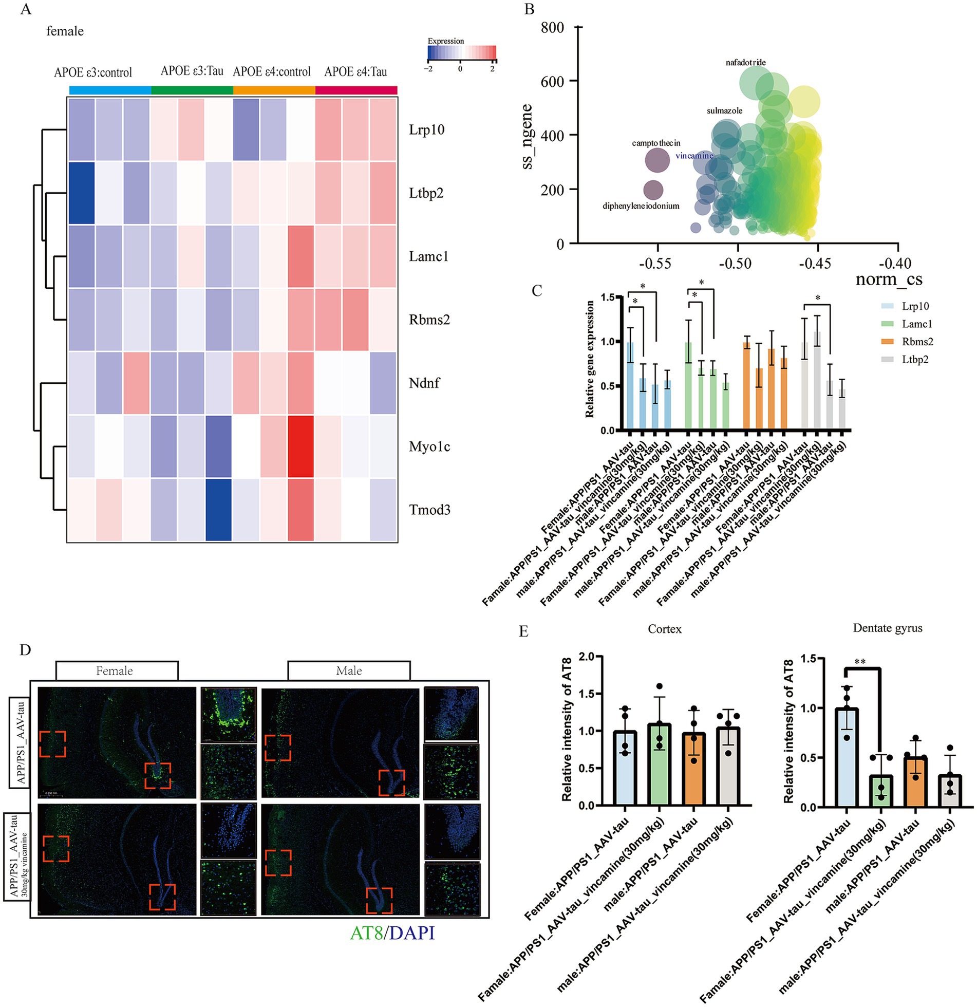 Figure 9. Animal data validation as well as drug prediction. (A) Heatmap of hub genes in GSE254103. (B) Connectivity map scoring bubble chart, (C) Relative mRNA levels of Lrp10, Lamc1, Rbms2 and Ltbp2 of brain cortex, n = 4. (D,E) Representative histological images and statistical chart in cortex and DG brain regions stained for AT8 (green), and nuclei (DAPI, blue) in APP/PS1 mouse brain 5 weeks following AAV-hTau injection, n = 3. Bar = 50 μm. * For p < 0.05, * * for p < 0.01.
