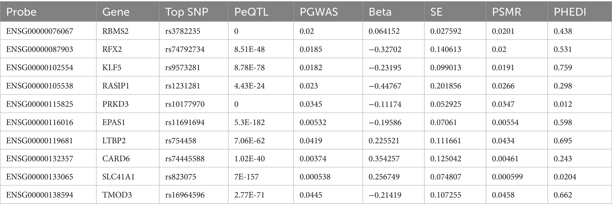 The SMR framework tested for causal associations by integrating gene expression and complex traits by leveraging cis-eQTL effects. We implemented the heterogeneity in dependent instruments (HEIDI) test to distinguish true pleiotropy from linkage disequilibrium (LD)-driven false positives. Heterogeneity In Dependent Instruments (HEIDI) is a method which seeks to address if many single nucleotide polymorphisms (SNPs) in a single region give Wald ratio (or ratio) estimates that are more different from each other than expected by chance under the assumption that each SNP only exhibits an effect due to linkage disequilibrium (LD) with the causal SNP. PHEIDI > 0.05 is considered to indicate no heterogeneity. Conversely, a significant HEIDI test (PHEIDI< 0.05) indicates that multiple independent causal variants may be present, rendering the SMR estimate unreliable (Sun et al., 2024; Xu et al., 2023). The Mendelian randomization (MR) method is shown in Supplementary Table S5.