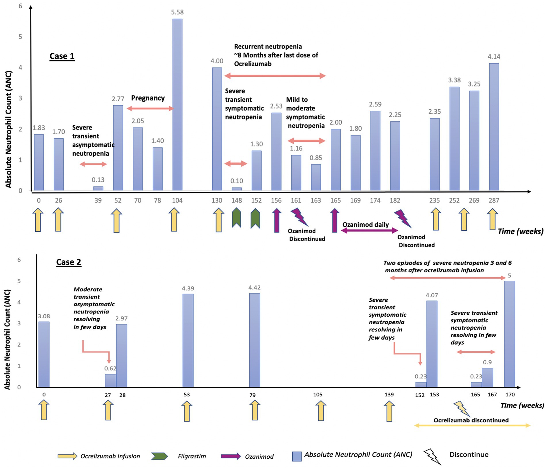 A 38-year-old female emergency physician with a history of RRMS was diagnosed 3 years prior after developing abrupt onset of leg weakness, gait disturbance, and dizziness. Treatment with ocrelizumab was initiated several months after MS diagnosis and was well-tolerated, leading to clinical stability. Three months after her 2nd round of ocrelizumab, she was found to have severe asymptomatic neutropenia (ANC 0.13 K/μL). It resolved spontaneously to normal levels (ANC 1.44 K/μL) within 5 days, and the patient continued ocrelizumab and received the third infusion uneventfully after consultation with hematology. Five months later, ocrelizumab was temporarily halted due to pregnancy, then resumed post-delivery with the fourth infusion given around 15 months from ocrelizumab cessation. Four and a half months following the fifth dose, she developed severe symptomatic neutropenia, with an ANC of 0 K/μL associated with fevers, cough, sore throat, myalgias, night sweats, and malaise. The patient was admitted and treated empirically with cefepime and posaconazole. An extensive infectious work up did not reveal a specific pathogen. Hematology was consulted and suspected this to be secondary to ocrelizumab, though it was felt to be unusual for neutropenia to present symptomatically at a time when blood drug levels would be expected to be very low. The patient underwent an extensive work up for hematological etiologies of neutropenia, all of which was unrevealing, including a normal bone marrow biopsy that demonstrated no sign of blasts or acute leukemia. She was started on filgrastim, and the ANC normalized. Given the severity of her MS, it was deemed that the risks of delaying disease modifying therapy were too high, and she began taking ozanimod several weeks after normalization of ANC.