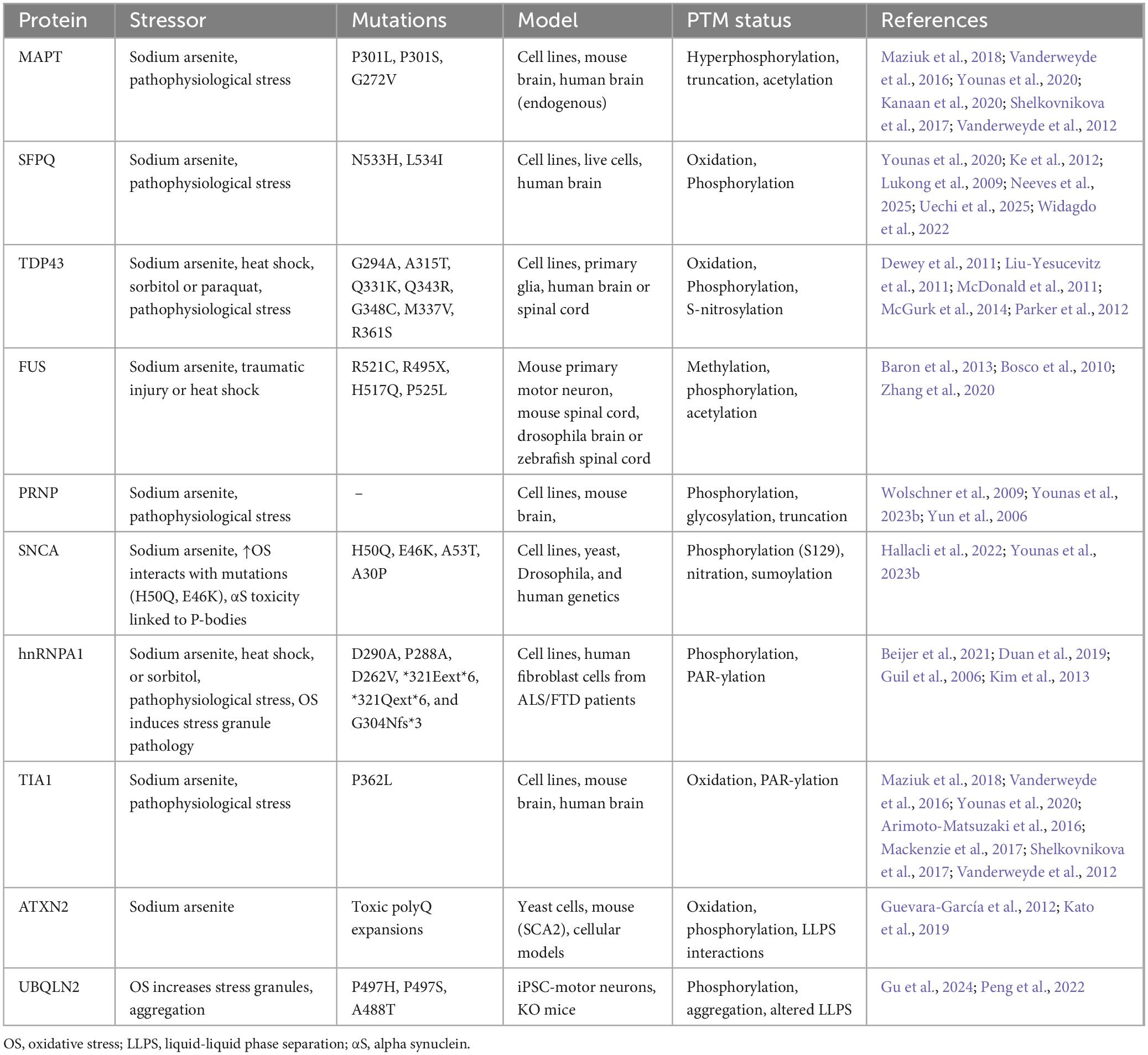 Multiple lines of evidence provide a strong evidence that SGs in cells exposed to environmental stress play the role of seeds for pathogenic protein aggregation in neurodegenerative disorders. First, several proteins [MAPT (Maziuk et al., 2018; Vanderweyde et al., 2016; Younas et al., 2020), TDP43 (Yan et al., 2025), FUS, SNCA (Younas et al., 2023b) and PRNP (Younas et al., 2023b)] that mount up in cytoplasmic aggregates are also components of these SGs (Ash et al., 2021; LeBlang et al., 2020; Yan et al., 2025; Younas et al., 2023b). Second, long lifespan and high metabolism of neurons make them specifically vulnerable to successive stress episodes and to cycles of SG assembly-disassembly (Bishop et al., 2010). Third, mutations in the disease-linked proteins can disrupt normal dynamics of SGs (Lenzi et al., 2015; Mateju et al., 2017; Murakami et al., 2015). Additionally, mutations in other components of SGs e.g., hnRNPA1 (Clarke et al., 2021), TIA1 (Apicco et al., 2018; Baradaran-Heravi et al., 2020; Jiang et al., 2022), ATXN2 (Guevara-García et al., 2012; Kato et al., 2019), UBQLN2 (Peng et al., 2022; Yan et al., 2025) can also disrupt SG dynamics (Table 1). Fourth, SG dense cores act as hotspots for protein aggregation (Maziuk et al., 2018; Vanderweyde et al., 2016; Yan et al., 2025). Stress granules (SGs) have emerged as a critical missing link that integrates genetic, cellular, and pathological evidence, completing the puzzle of aberrant protein aggregation cascade in neurodegenerative diseases (Cui et al., 2024; Dudman and Qi, 2020; Gu et al., 2024; Yuan et al., 2025). A summary of key proteins, their associated stressors, reported mutations, models used for study, post-translational modifications (PTM), and supporting references are described in Table 1.