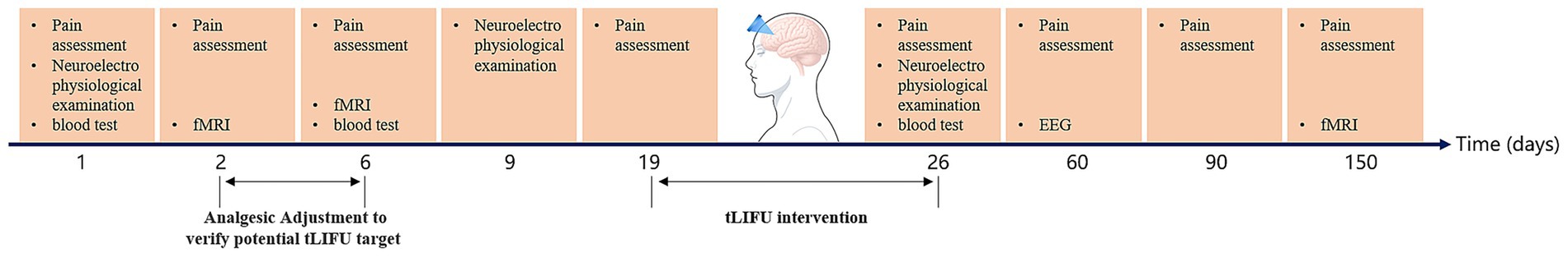 Central post-stroke pain (CPSP) manifests as persistent or intermittent pain following cerebral infarction or hemorrhage, described as “one of the most agonizing, disabling, and refractory pain syndromes” (Klit et al., 2009; Henry et al., 2008). The current pathogenesis of CPSP remains unclear, and predominant theories include central sensitization, disinhibition of the ventral posterior lateral thalamic nucleus, dysfunctions in pain signaling pathways, functional alterations in the thalamus and other brain regions, and neurotransmitter imbalances. There is a lack of satisfactory efficacy in existing treatment methods for dealing with CPSP. The non-invasive neuromodulation techniques have gained increasing clinical attention for CPSP treatment in recent years (Cheng et al., 2023; Mohanan et al., 2023). Approaches such as transcranial magnetic stimulation (TMS) and transcranial direct current stimulation (tDCS) aim to alleviate pain by applying pulsed magnetic or electric fields to the cerebral cortex, triggering a cascade of physiological responses. However, both tDCS and TMS suffer from low spatial resolution, with a broad radius of action on the order of centimeters (Kubanek, 2018). Therefore, the primary objective of this study is to explore a non-invasive, precise, and effective neuromodulation method that reduces dependence on pain medications. The emergence of transcranial low-intensity focused ultrasound (tLIFU) technology, which has been demonstrated to exert reversible excitatory or inhibitory effects on neural activity (Darrow, 2019), offers a novel, non-invasive deep neuromodulation approach. By utilizing mechanical energy to achieve non-destructive and reversible neuromodulation of neuronal activity, this technique provides millimeter-level spatial resolution and adjustable focal depth, making it suitable for targeting deep brain structures with high spatial precision (Strohman et al., 2024).