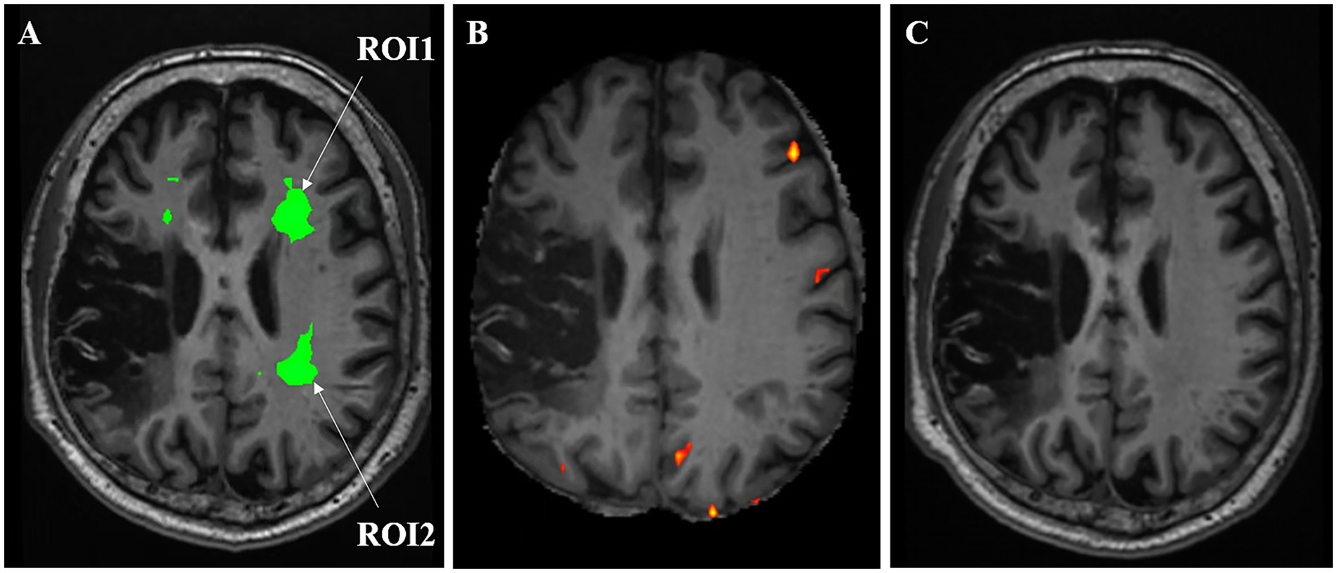 Figure 2. Changes in BOLD-fMRI of ROIs before (A) and after (B) analgesic drug adjustment and at day 150 follow-up (C).