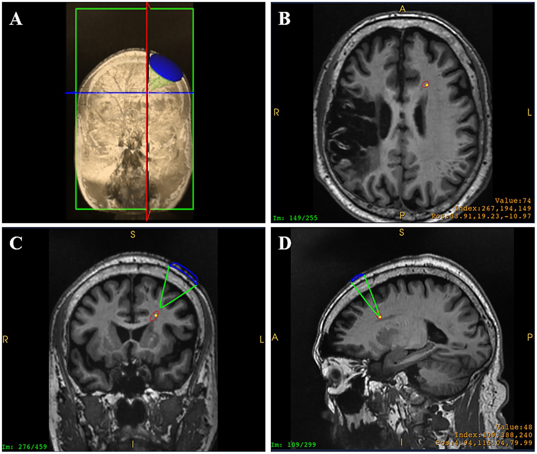 Figure 4. Transducer placement (A) and real-time monitoring of tLIFU focus in the horizontal plane (B), the coronal plane (C), and the sagittal plane (D) within the therapeutic session (the yellow dot represents the preset neuromodulation target, and the red ellipse represents the focus of the ultrasound transducer. A, anterior; F, feet; H, head; I, inferior; L, left; P, posterior; R, right).