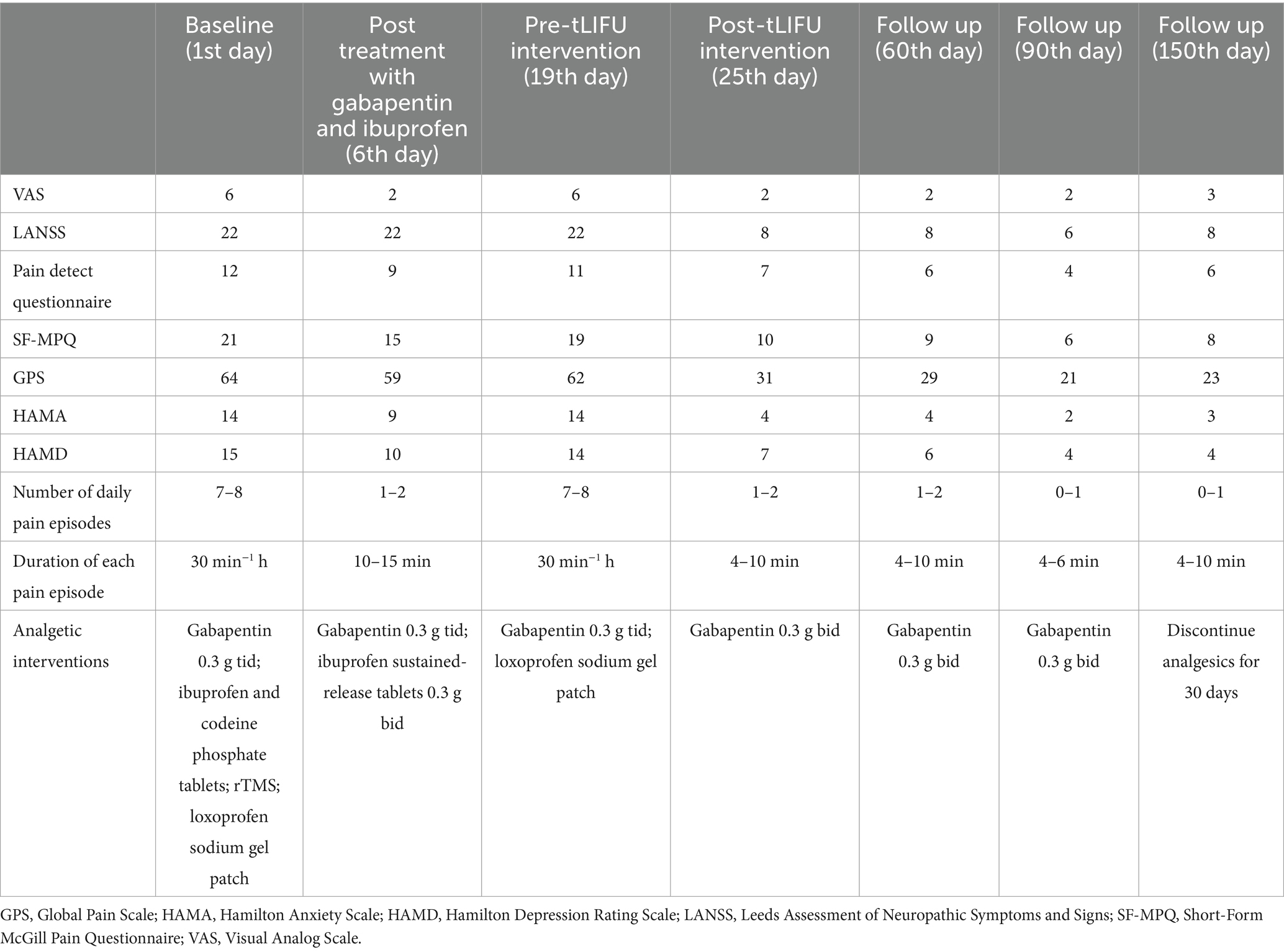 Notably, EEG performed immediately after the final tLIFU treatment captured epileptiform discharges during photic stimulation (see Table 2). However, follow-up EEG at 2 months showed no epileptiform activity, and the patient had no history of epileptic seizures since the stroke onset. We considered several aspects for the following reasons: first, focused ultrasound is a mechanical wave, and the acoustic radiation force may activate mechanosensitive ion channels. The imbalance between excitation and inhibition in the CNS after cerebral infarction is primarily associated with ion channels. Alterations in ion channels may contribute to abnormal synchronous discharges in local neurons (Kubanek et al., 2016; Steinlein, 2014), thereby inducing epileptiform discharges, which could represent an immediate effect of tLIFU. The modulation of neuronal activity by focused ultrasound, however, is reversible, which may also explain the absence of epileptiform discharges observed at the second follow-up. Second, the occurrence of stroke may increase the risk of seizures. Studies have shown that cerebral infarction in the middle cerebral artery supply area carries a high risk of post-stroke epilepsy (Zou et al., 2015). Third, gabapentin may exert dual effects of pain relief as well as seizure prevention in this case. The dosage reduction of gabapentin following tLIFU treatment might potentially elevate the risk of epileptiform discharges observed on EEG. However, it is concerning whether the epileptiform discharges observed via EEG are associated with tLIFU application. A previous study has reported that deep-brain stimulation (DBS) implanted in the ACC for refractory pain management induced epileptic seizures or even status epilepticus in some participants, regardless of whether the DBS was turned on or off. This finding was attributed to excessive stimulation intensity. Reducing the DBS intensity to a safe threshold that did not induce seizures resulted in diminished analgesic efficacy (Nüssel et al., 2022; Maslen et al., 2018). In this case, the ISPPA of tLIFU targeting the cingulum bundle was 5.37 mW/cm2, far below the U.S. Food and Drug Administration (FDA) recommendation of ISPPA ≤ 190 W/cm2. Moreover, the ISPTA was 53.73 mW/cm2, significantly lower than the FDA recommendation of ISPTA ≤ 720 mW/cm2 (US Food and Drug Administration, 2019). In a study demonstrated by Bubrick et al. (2024), six patients with refractory epilepsy underwent tLIFU treatment, among whom one patient experienced a typical epileptic seizure during the first session. When the duty cycle was reduced from 50 to 18.3%, no further seizures occurred, and no adverse events were observed during follow-up. In the current study, the duty cycle was 1%, indicating an extremely low likelihood of triggering epileptic seizures. At the 150-day follow-up, some of the patients’ indices showed slight rebound. We consider two possible reasons for this: first, many of these indices are influenced by the subjectivity of both the patient and the assessor; second, at the time of assessment, the patient had already discontinued analgesic medication for 1 month. Therefore, such fluctuations appear acceptable, and longer-term tracking is necessary to determine the definitive effects of tLIFU. There are several crucial points to acknowledge here. One is that this study employs an optical navigation system. While it offers greater operational ease than MRI-guided navigation, the system displays the tLIFU focal point in real time as a “theoretical” position, calculated based on the patient’s T1-weighted MRI images. The actual ultrasound propagation path is influenced by factors such as the skin, underlying tissues, and the skull. Future technological advances, including the development of ultrasound phased arrays, hold promise for optimizing the clinical application of tLIFU (Hynynen and Jones, 2016). Another crucial point to acknowledge is that, while the modulatory effect of tLIFU on pain has been reported (Feng et al., 2021; Lizi et al., 2024; Shin et al., 2023; Liao et al., 2021; Lin et al., 2025) and is supported by the compelling therapeutic effect observed in our CPSP case, its efficacy for complex regional pain syndrome or other drug-resistant pain types remains unclear. Furthermore, given the subjective nature of pain and its multitude of influencing factors, randomized controlled trials are warranted to elucidate the efficacy and mechanisms of tLIFU for pain management.