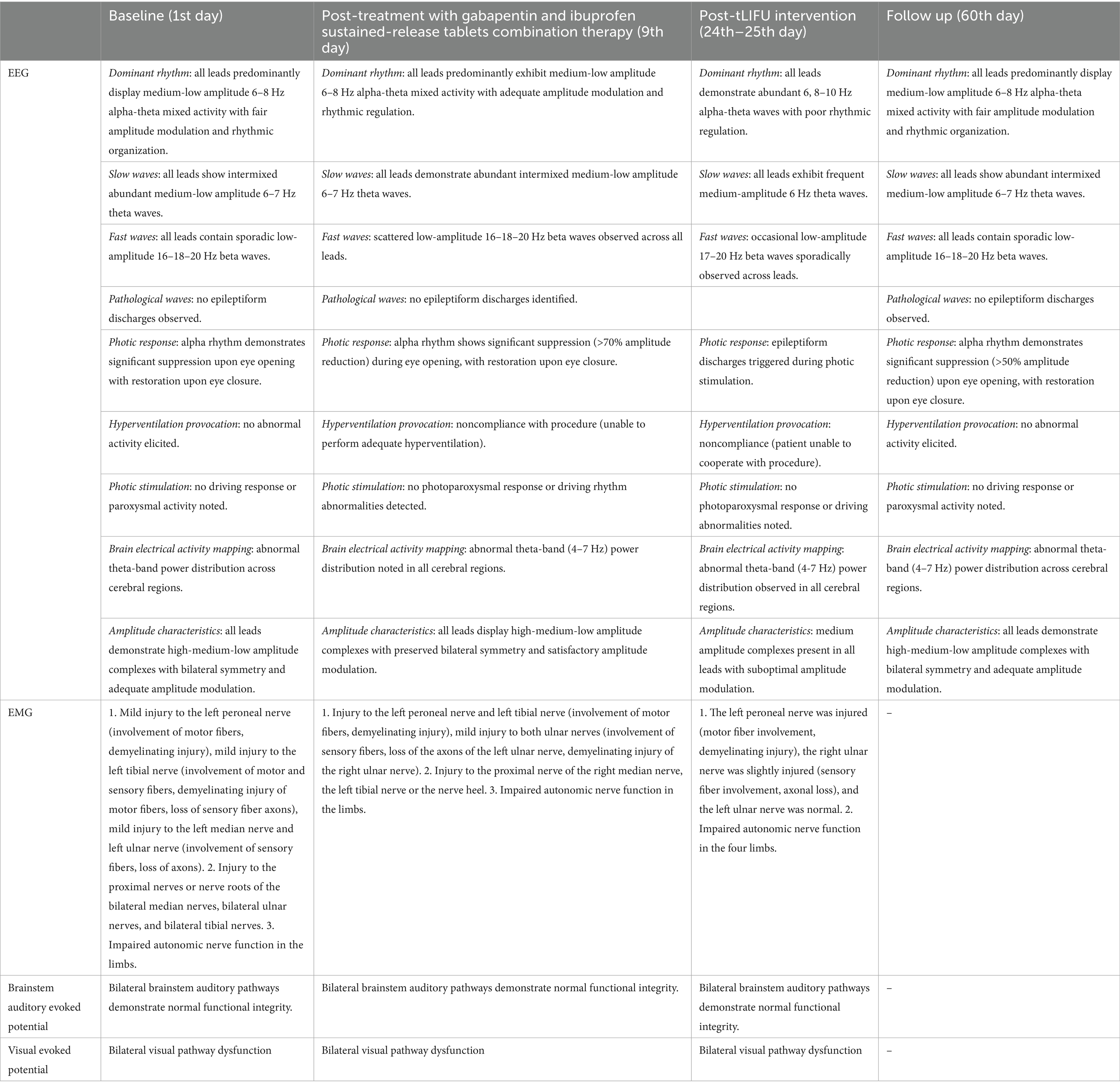 Interestingly, we serendipitously observed that the patient’s motor conduction of the left tibial nerve, as well as the sensory conduction of the left ulnar nerve, were normalized following tLIFU treatment, as EMG displayed. The cingulum bundle has a complex structure composed of multiple fiber tracts, including thalamocortical projections, cingulate gyrus projections, and projections to the prefrontal as well as posterior parietal cortices, which coordinate networks among these brain regions. Data from MRI and PET studies indicate that its functions encompass a wide range of processes, including sensory processing, memory, spatial function, reward, cognition, emotion, visceral motor activity, and endocrine regulation (Kollenburg et al., 2025). In this case, the EMG improvements may be attributed to the natural recovery processes on the one hand, and on the other hand, we hypothesize that tLIFU-mediated cingulum bundle modulation could alleviate local central sensitization and pain-related abnormal discharges, thereby improving the sensory function of the left ulnar nerve. Furthermore, pain relief may regulate cognitive-emotional signals that influence motor decision-making, resulting reduced abnormal muscle activity then potentially facilitates motor conduction recovery of the left tibial nerve. Specifically, tLIFU-mediated neuromodulation of the CNS may not only exert targeted effects on specific brain regions but could also influence peripheral nerve function via potential central-peripheral communication mechanisms. This provisional hypothesis, however, requires rigorous validation through further investigations.