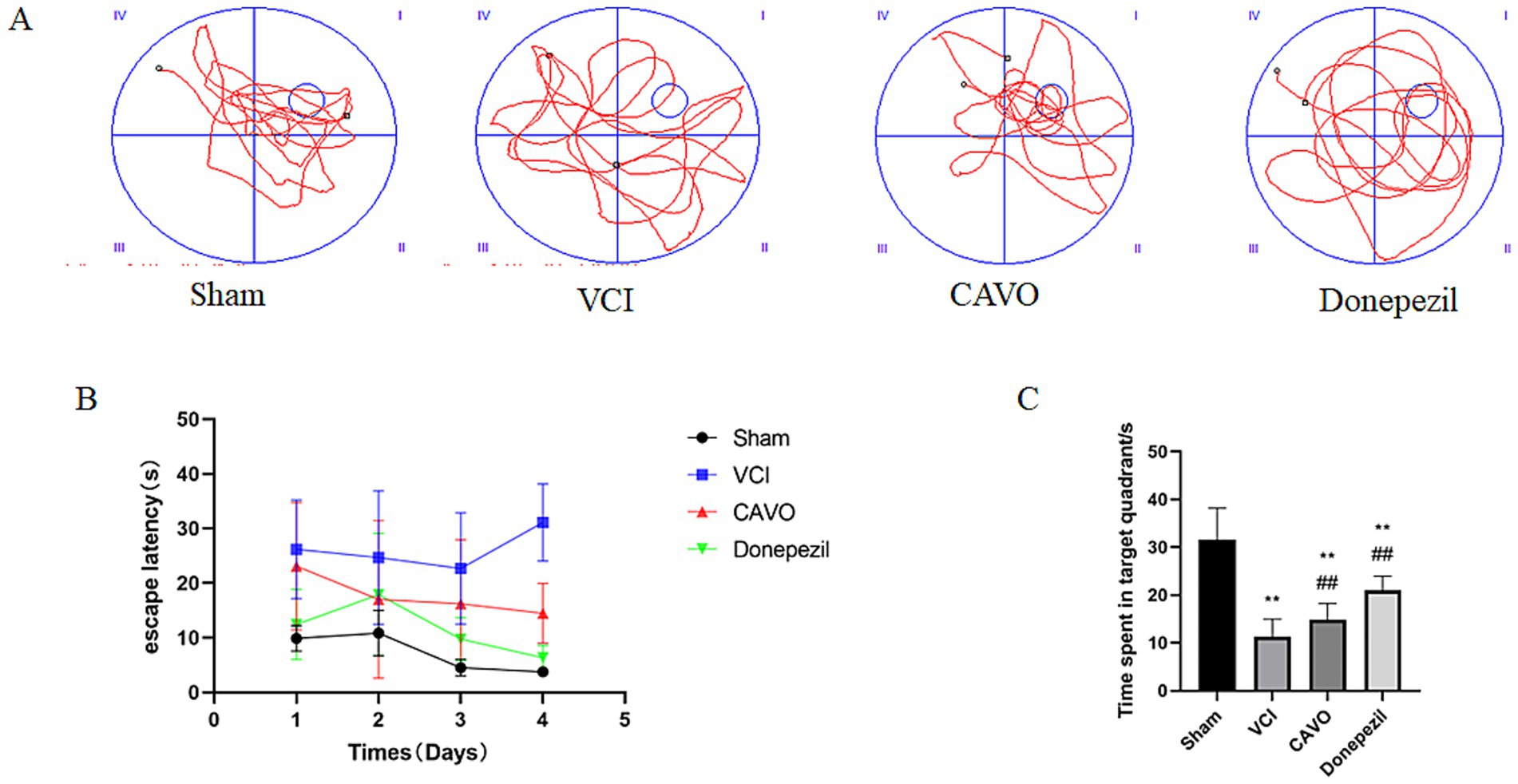 The VCI group’s escape latency was significantly higher on day 4 of training than that of the Sham group (p < 0.01). On day 4 of the experiment, the CAVO group’s escape latency was significantly lower than that of the VCI group (p < 0.01), and the Donepezil group’s escape latency was lower than that of the VCI group (p < 0.01).