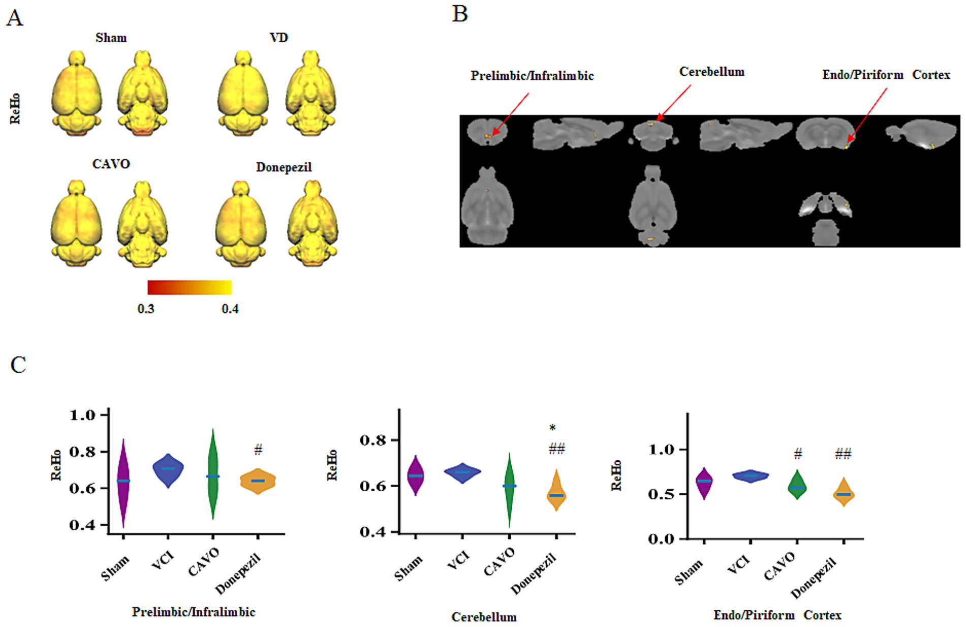 Figure 2. Results of ReHo analysis. (A) Mean ReHo values in the brains of rats in the Sham, VCI, CAVO, and Donepezil groups were quantified using the SIGMA standard template. (B) Functional maps of the differential brain regions [limbic cortex, pyriform cortex (piriform cortex), endopiriform cortex (endopiriform cortex), and cerebellum (cerebellum)] resulting from ANOVA. (C) ReHo values in each differential brain region [limbic cortex, pyriform cortex (piriform cortex), and cerebellum (cerebellum)] of rats in each group. Compared with the Sham group, *p < 0.05; compared with the VCI group, #p < 0.05 and ##p < 0.01.