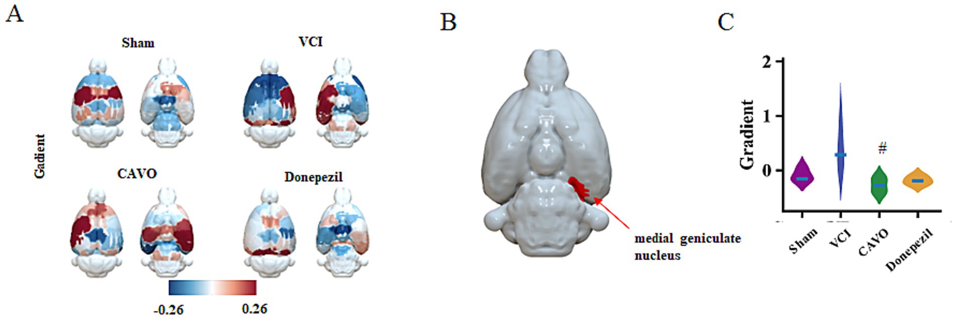 Figure 3. Gradient imaging results. (A) Quantification of the average gradient values in the brains of rats in Sham, VCI, CAVO, and Donepezil groups using the SIGMA standard template. (B) Differential brain regions [medial geniculate nucleus (MGN)] obtained after ANOVA. (C) Statistics of gradient values in the brain region of the medial geniculate nucleus (MGN) in each group of rats. #p < 0.05 compared with the VCI group.