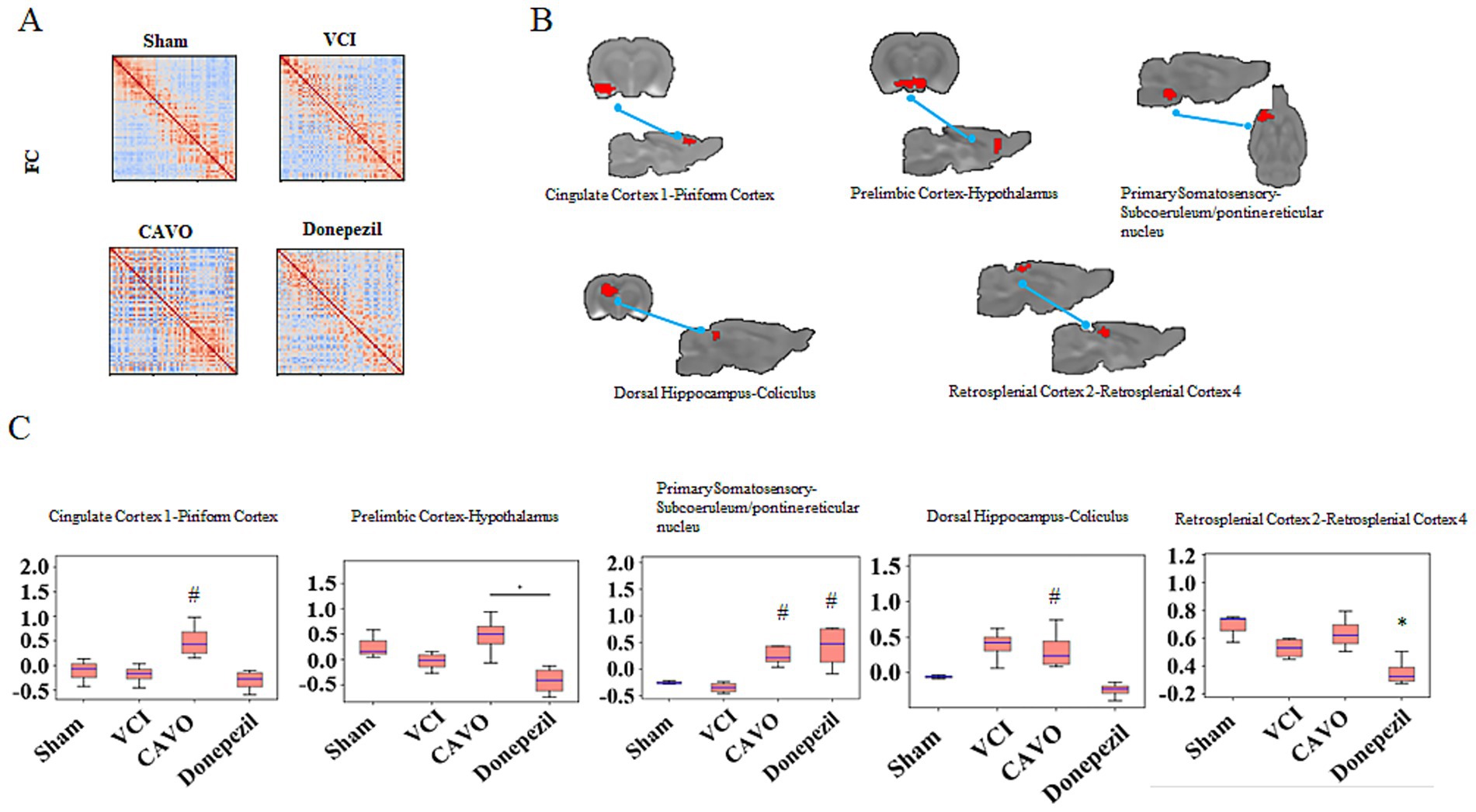 FC was screened in a total of five groups to examine specific brain region connectivity. In the cingulate cortex–piriform cortex, FC strength was reduced in the VCI group compared with the Sham group, was elevated in the CAVO group compared with the VCI group (p < 0.05), and no statistically significant difference was observed between the Donepezil and the VCI groups.