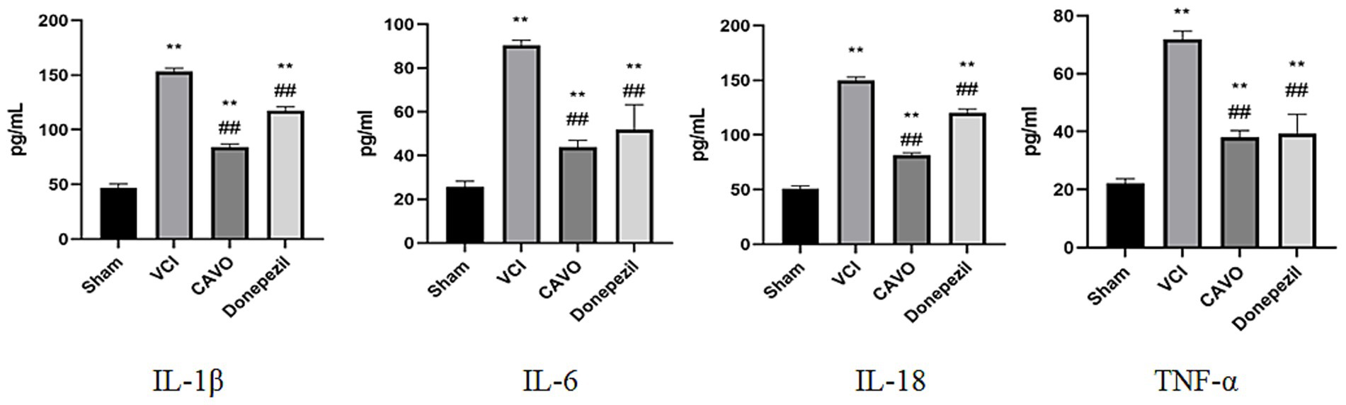 Compared with the Sham group, the serum levels of interleukin 1β (IL-1β), interleukin 6 (IL-6), and tumor necrosis factor α (TNF-α) were significantly higher in the VCI group (p < 0.01). Compared with the VCI group, the serum levels of IL-1β, IL-6, IL-18, and TNF-α were significantly lower in the CAVO group (p < 0.01). Compared with the VCI group, serum levels of IL-1β, IL-6, IL-18 (150.10 ± 2.88 vs. 120.21 ± 3.60), and TNF-α were significantly lower (p < 0.01) in the Donepezil group, as shown in Figure 5.