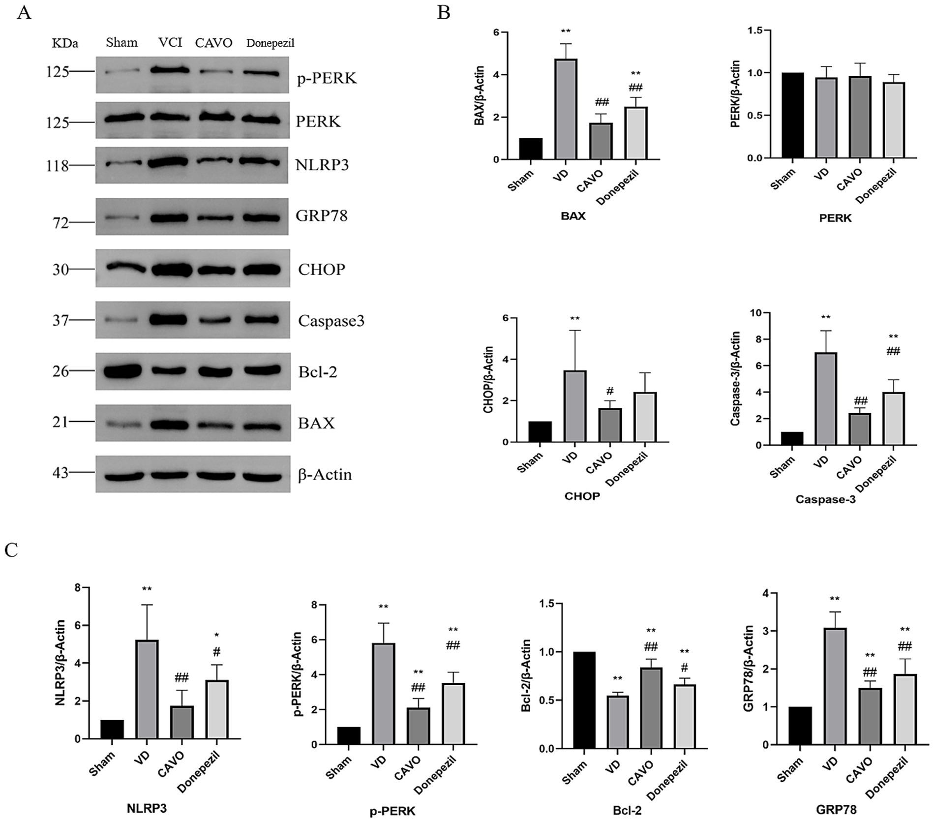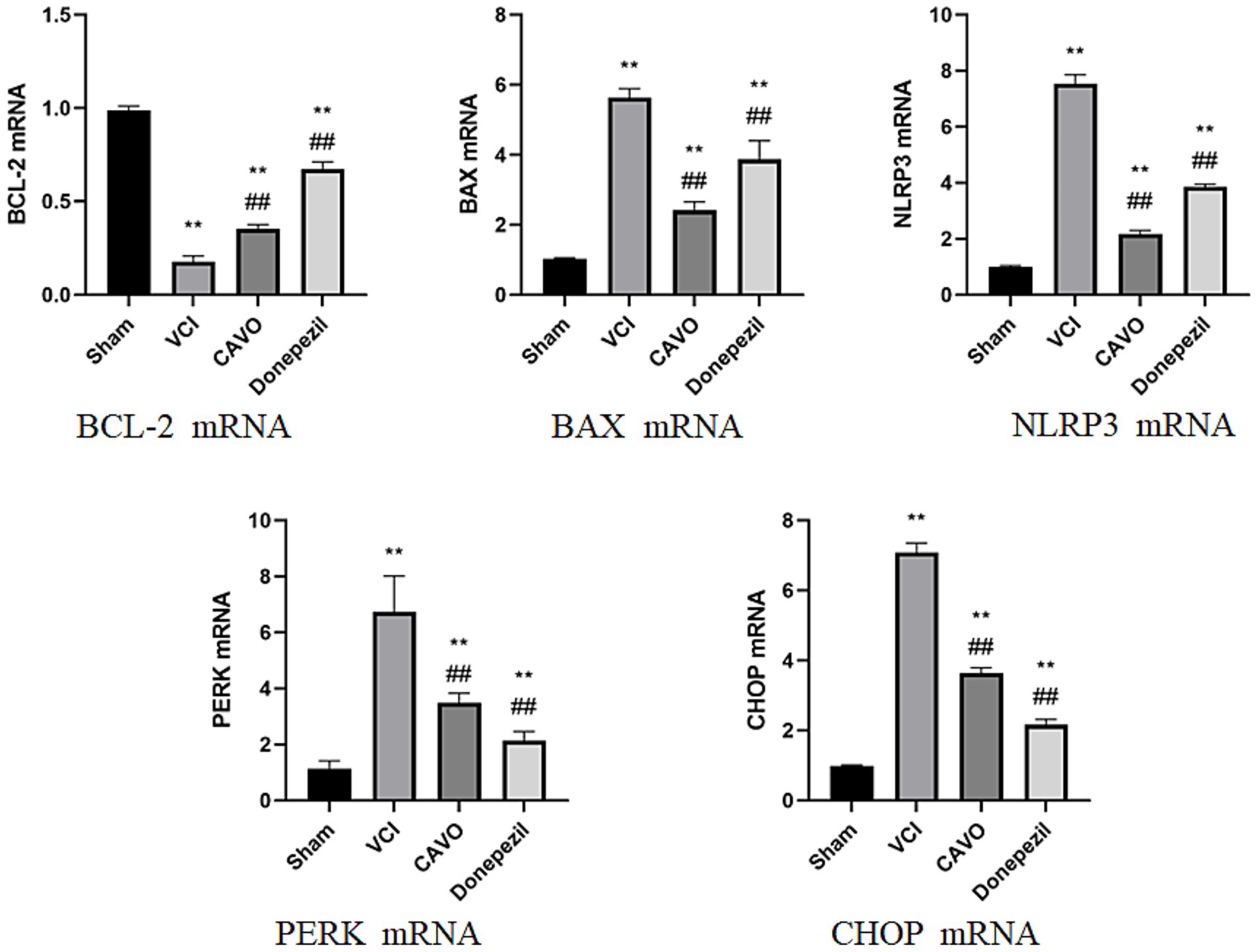Compared with the Sham group, CHOP, PERK, NLRP3 and BAX mRNA expression was significantly higher (p < 0.01) and Bcl-2 mRNA expression was lower (p < 0.01) in the VCI group. Compared with the VCI group, CHOP, PERK, NLRP3 and BAX mRNA expression was significantly lower (p < 0.01) and Bcl-2 mRNA expression was significantly higher (p < 0.01) in the CAVO and Donepezil (Figure 7).