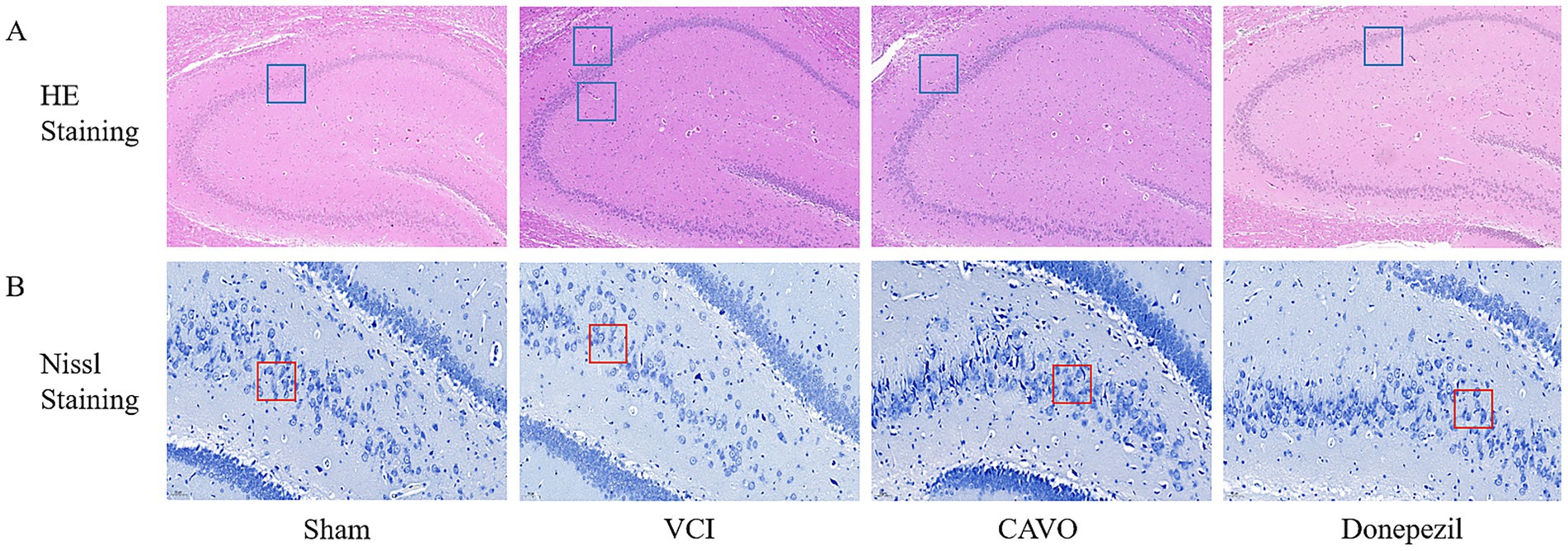 Figure 8. Results of pathological staining experiments in rat hippocampal area. Repair effects of CAVO treatment on brain cell damage in VD mice. (A) Nissl staining revealed morphological changes in neurons across different groups. Following administration, hippocampal cell morphology in the CAVO and Donepezil groups showed relative recovery, with increased hippocampal cell counts. This indicates that the treatment exerts a certain regulatory effect on hippocampal cells, whose outlines appeared clearer than those in the model group. (B) Histopathological assessment of hippocampal regions in all groups via HE staining. Compared to the model group, CAVO and Donepezil groups showed partial recovery of cell morphology and reduced numbers of atrophic cells. Scale bar = 50 μm, magnification 400×.