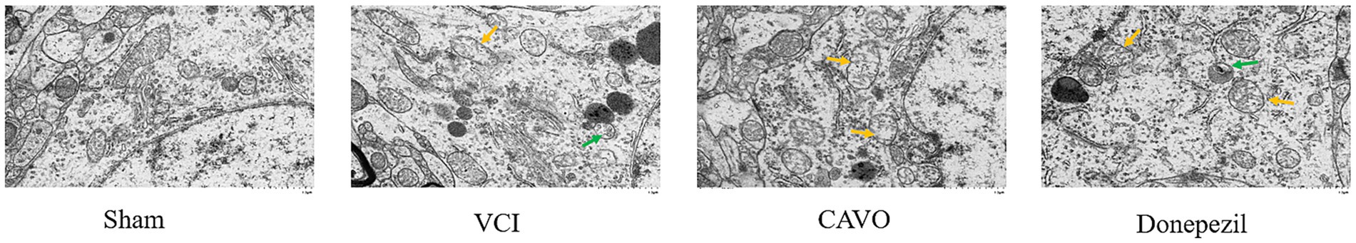 Figure 9. Transmission electron microscopy images of hippocampal organization. Transmission electron microscopy of mitochondria in the rat hippocampus (sham-operated group, VCI group, CAVO group, and Donepezil group). Scale bar = 1 μm, magnification ×12,000. Orange arrows indicate mildly swollen mitochondria; green arrows indicate autophagic vesicles.