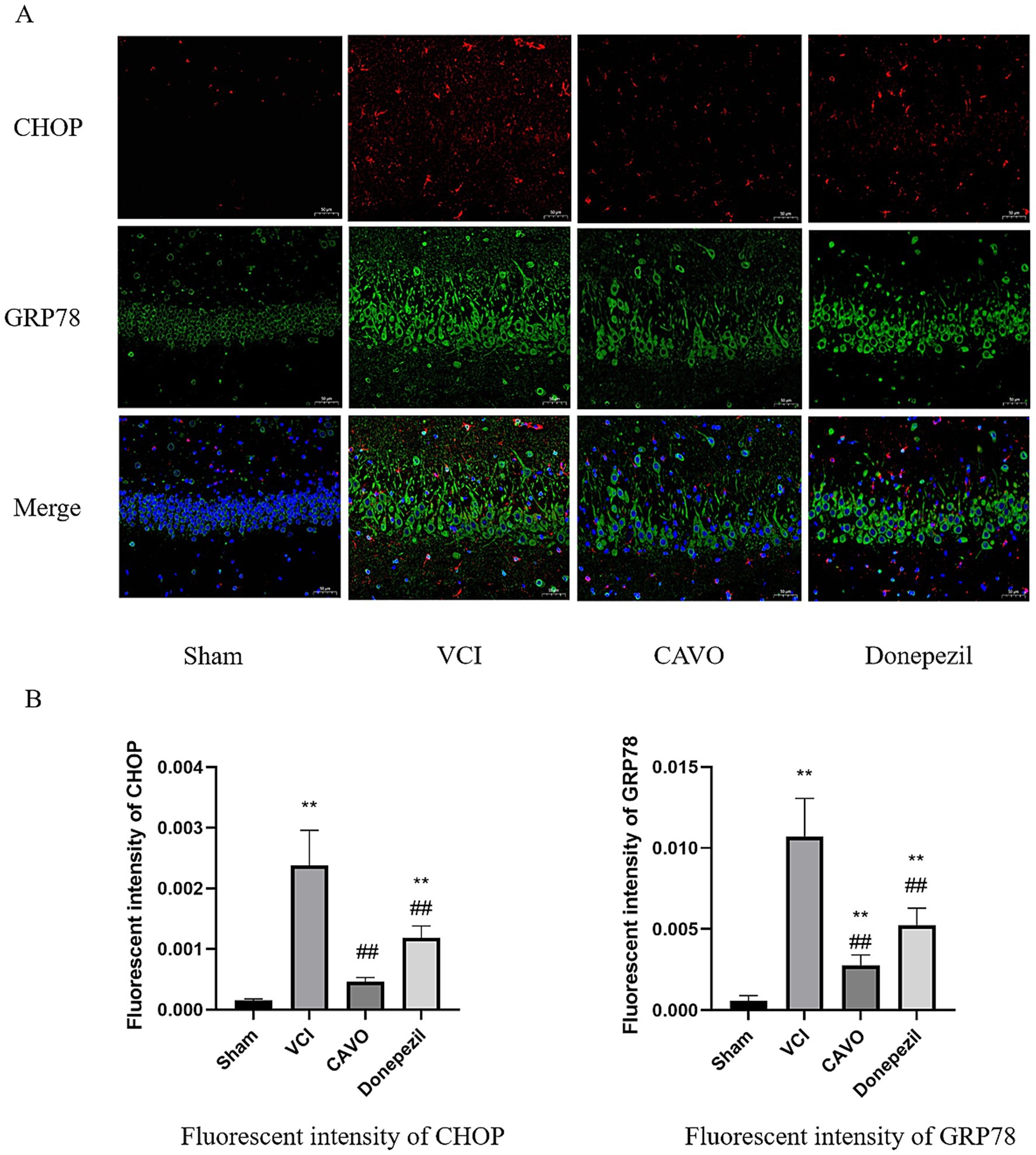 Figure 10. Immunofluorescence results of CHOP and GRP78 in rat brain tissue. (A) Immunofluorescence staining results for CHOP and GRP78 in the hippocampal tissues of rats in the Sham, VCI, CAVO, and Donepezil groups. Bars = 50 μm, magnification 400×. (B) Relative fluorescence intensity of CHOP and GRP78 in hippocampal tissues of each group. Values are expressed as mean ± SEM (n = 6). *p < 0.05, **p < 0.01 compared to Sham group, #p < 0.05, ##p < 0.01 compared to VCI group. * Indicates statistical difference from the Sham group and # indicates statistical difference from the VCI group.