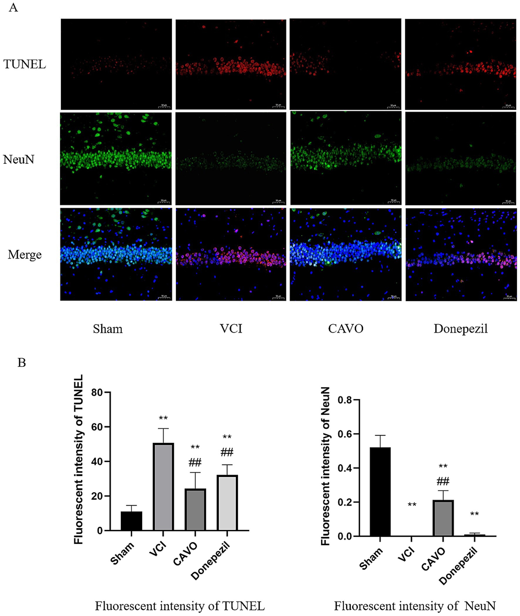 Figure 11. Immunofluorescence results of TUNEL and NeuN in rat brain tissue. (A) Immunofluorescence staining of TUNEL and NeuN in the hippocampal tissues of rats in the Sham, VCI, CAVO, and Donepezil groups. Bars = 50 μm, magnification 400×. (B) Relative fluorescence intensity of CHOP and GRP78 in hippocampal tissues of each group. Values are expressed as mean ± SEM (n = 6). *p < 0.05, **p < 0.01 compared to Sham group, #p < 0.05, ##p < 0.01 compared to VCI group. * Indicates statistical difference from the Sham group and # indicates statistical difference from the VCI group.