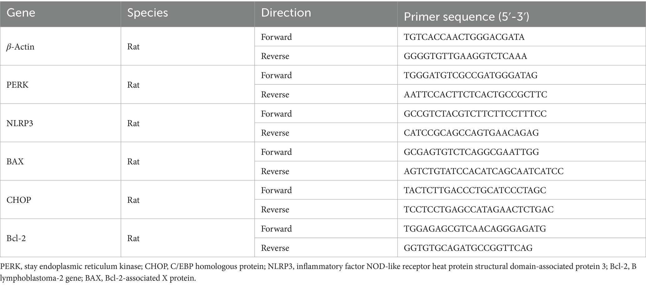 Proteins were extracted from rat hippocampal tissue using RIPA lysis buffer, followed by centrifugation, shaking, and homogenization. Nuclear proteins were extracted using a nuclear extraction kit in accordance with the manufacturer’s protocol. Protein concentration was determined using the bicinchoninic acid assay (BCA) kit (BL521A, Biosharp, Beijing, China), and 10% ~ 12% sodium dodecyl sulfate-polyacrylamide gel electrophoresis (SDS-PAGE) was used to separate total and nuclear proteins from hippocampal tissues. These tissues were then transferred onto PVCIF membranes by wet transfer. The membrane was closed with 5% skimmed milk solution on a 4 °C shaker for 2 h. The primary antibody was incubated overnight, and the secondary antibody for 1 h. Band intensities were analyzed using ImageJ software (Peng et al., 2022). β-actin was used as a loading control protein. Primary antibody information: β-Actin, Cat No. AF7018 1:5,000; CHOP, Cat No. AF6277, 1:1,000; PERK, Proteintech, Cat No. 10701-1-AP, 1:1,000; p-PERK, Cat No. AF5304 1:1,000; caspase-3, Cat No. AF6311; GRP78, Cat No. AF5366; NLRP3, Cat No. DF15549, 1:1,000. Secondary antibody information: goat anti-rabbit IgG (H + L) HRP, MULTI SCIENCES, Cat No. 1 GAR0072; goat anti-mouse IgG (H + L) peroxigen peroxidase, MULTI SCIENCES, Cat No. GAM0072.