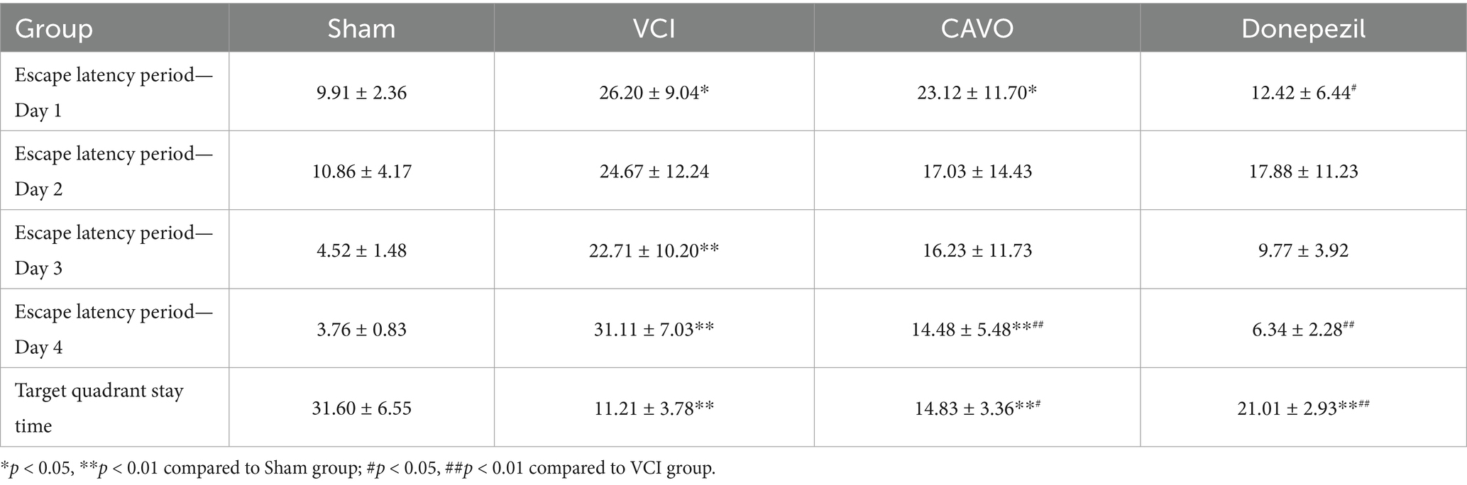 During the experiment, two rats perished due to surgical complications. On day 1 of training, the escape latency of rats in the VCI and CAVO groups was elevated compared to that of the Sham group (p < 0.05). No significant differences were observed in the escape latency of rats in the CAVO group on day 1 of the experiment compared to the VCI group, and there was a decrease in the escape latency of rats in the Donepezil group on day 1 of the experiment compared to the VCI group.