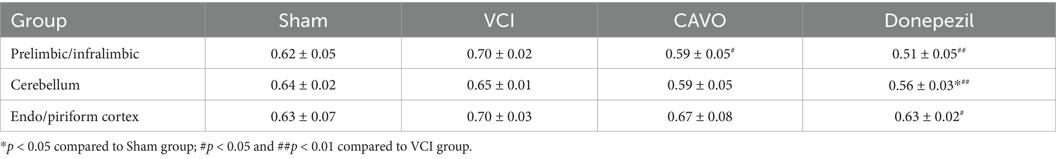 ReHo analysis screened out three groups of differential brain areas. The VCI group had higher ReHo values in the limbic cortex (prelimbic/infralimbic) than the Sham group, and the CAVO and Donepezil groups had lower ReHo values compared with the VCI group (p < 0.05). In the endopiriform cortex, the VCI group had higher ReHo values than the Sham group, and the CAVO group had lower ReHo values than the VCI group (p < 0.05). In the piriform cortex, ReHo values were increased in the VCI group compared to the Sham group and decreased in the CAVO and Donepezil groups compared to the VCI group (p < 0.05). In the cerebellum, ReHo values were increased in the VCI group compared to the Sham group and decreased in the CAVO and Donepezil groups compared to the VCI group (p < 0.05). Overall, the Donepezil group had decreased ReHo values (p < 0.01) (see Figure 2 and Table 3).