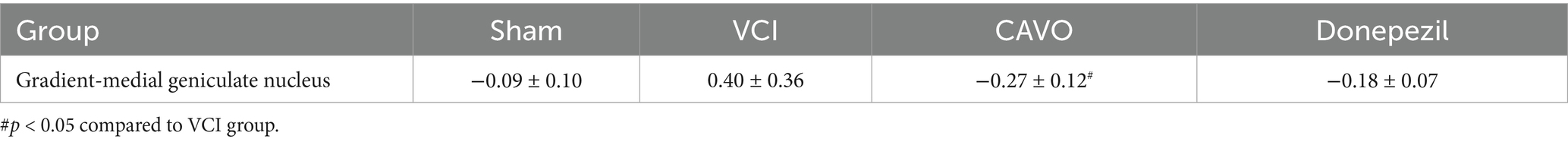 Gradient analysis screened a total of one group of differential brain regions. In the medial geniculate nucleus (MGN), the gradient value was increased in the VCI group compared with the Sham group, the gradient value was decreased in the CAVO group compared with the VCI group (p < 0.05), and there was no statistically significant difference between the Donepezil and VCI groups (see Figure 3 and Table 4).