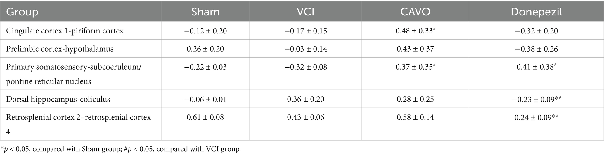 FC strength in the retrosplenial cortex 2–retrosplenial cortex 4 was lower in the VCI group than in the Sham group, higher in the CAVO group than in the VCI group, and higher in the Donepezil group than in the VCI group (see Figure 4 and Table 5).