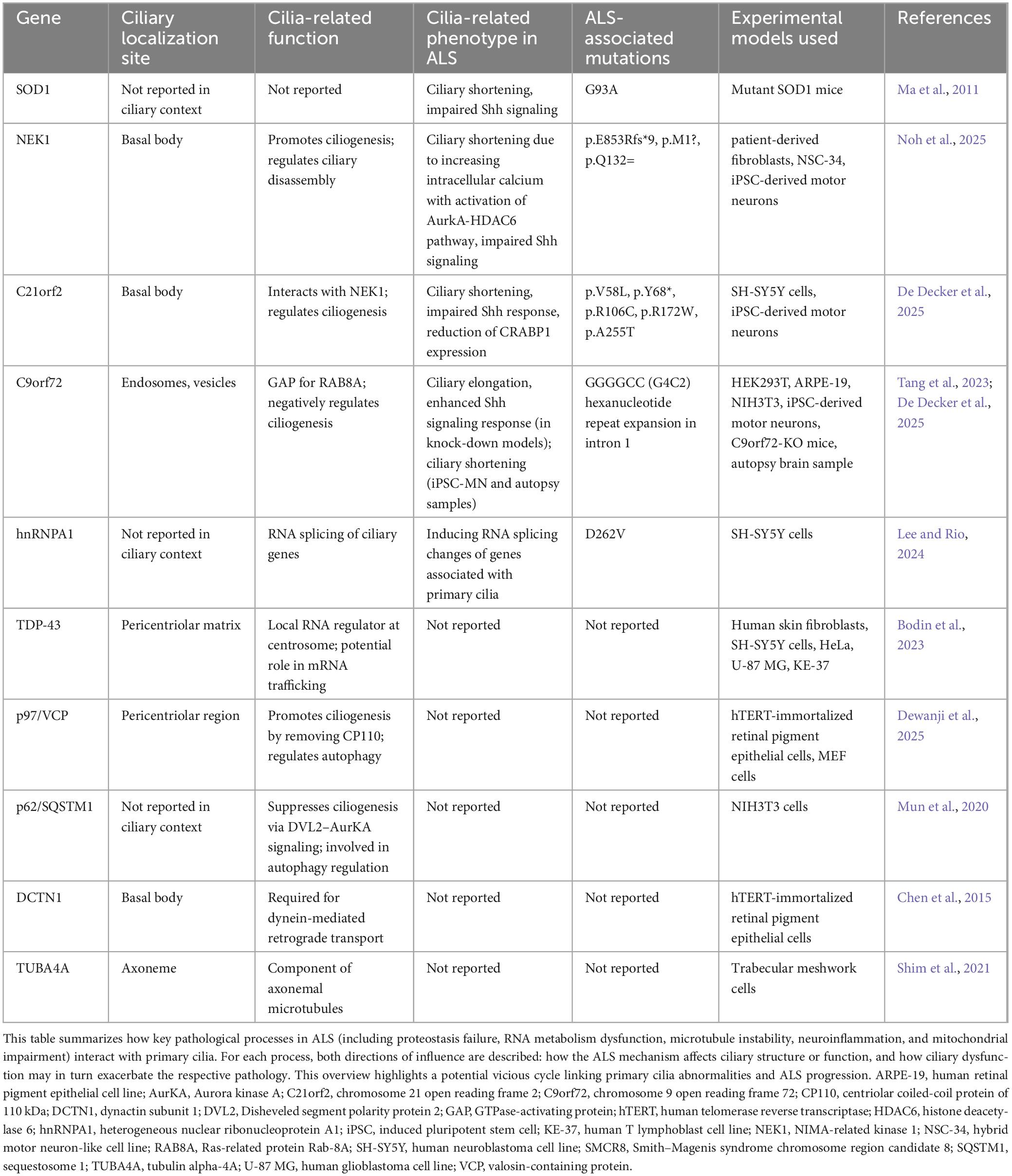 Finally, in this section we discuss several key areas for future research into the role of primary cilia in ALS. First, the relationship between primary cilia and ALS-related pathologies requires further exploration. Although several ALS-related genes have been implicated in ciliary dysfunction, including NEK1, C21orf2, and C9orf72, whether impaired ciliogenesis is a common feature across ALS subtypes remains unclear (Tang et al., 2023; De Decker et al., 2025; Noh et al., 2025). Further studies are warranted to examine how ALS-related mutations affect ciliogenesis and contribute to disease mechanisms. Determining whether ciliary degeneration represents a primary pathogenic event in ALS or arises secondarily in response to other cellular disturbances is also important, as this distinction has major implications for therapeutic targeting. No studies have investigated the causal relationship between the formation of TDP-43-positive inclusions, which are observed in the majority of ALS cases, and primary cilia dysfunction. Clarifying this point might be important for determining whether primary cilia abnormalities represent a common pathogenic mechanism in ALS.