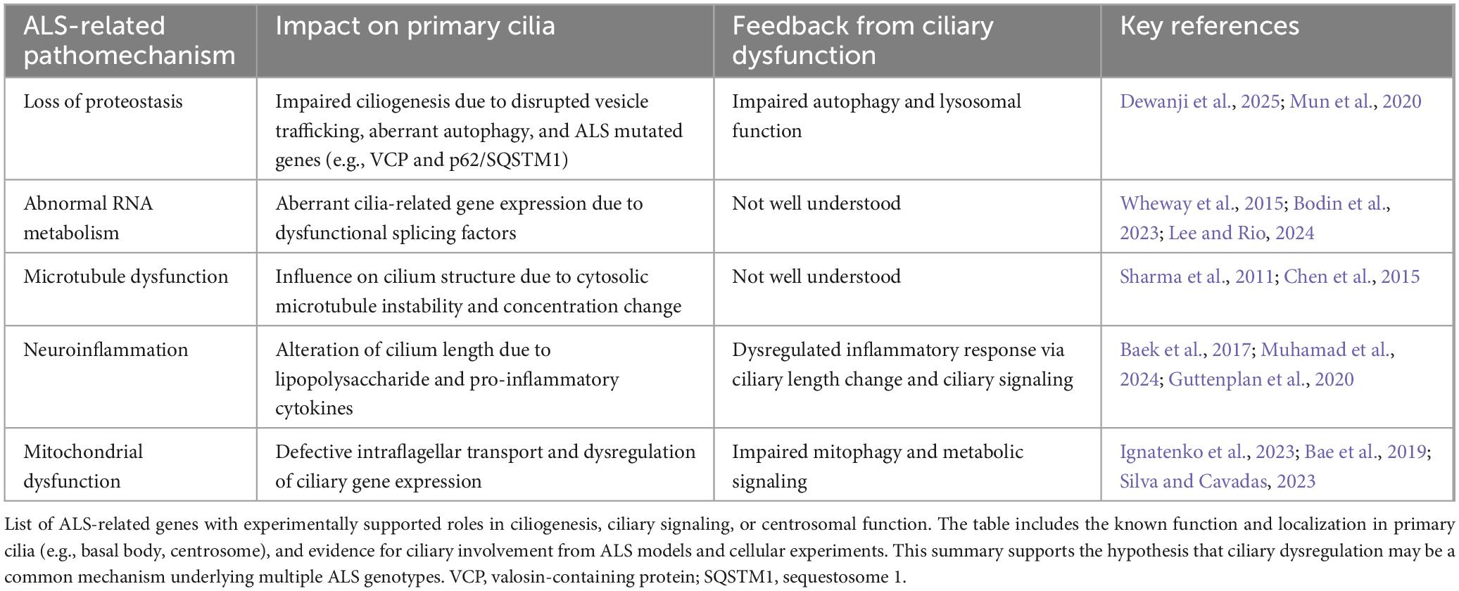 In this section, we focus on abnormal RNA metabolism, loss of proteostasis, microtubule dysfunctions, neuroinflammation, and mitochondrial dysfunction, all of which are known to be associated with both ALS and cilia (Hu et al., 2024; Table 2). Importantly, many of these pathological processes can either induce ciliary defects or are themselves triggered by ciliary dysfunction (Figure 2). This bidirectional or potentially cyclical relationship between ALS and cilia may be a key element in advancing our understanding of disease mechanisms and identifying novel therapeutic targets.