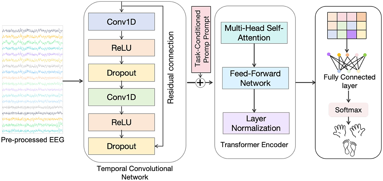 Unlike conventional fine-tuning approaches that adjust network parameters, our method leverages these task-conditioned prompts to encode individualized neural signatures and inject them directly into the feature extraction pipeline. The prompt refers here to a small set of continuous tokens that condition the downstream encoder on subject-specific context. Specifically, TCPL incorporates a Task-Conditioned Prompt (TCP) module that generates subject-specific prompts from a few calibration samples, a Temporal Convolutional Network (TCN) for capturing local temporal dynamics of oscillatory patterns (Bai et al., 2018), and a Transformer module for modeling global cross-channel dependencies (Vaswani et al., 2017; Dosovitskiy et al., 2021). These modules are jointly optimized within a meta-learning framework (Finn et al., 2017; Nichol et al., 2018), which trains the model across multiple subject-level tasks, enabling it to rapidly adapt to new individuals with minimal calibration data (Duan et al., 2020; Zhou et al., 2019). Prompt-based conditioning is especially suitable for EEG because (i) it enables parameter-efficient personalization (only the prompt generator needs to synthesize task-specific tokens), (ii) it lets the backbone retain a stable shared representation while being dynamically modulated by subject context, and (iii) continuous prompts can capture subtle distributional shifts without overfitting on extremely small support sets.