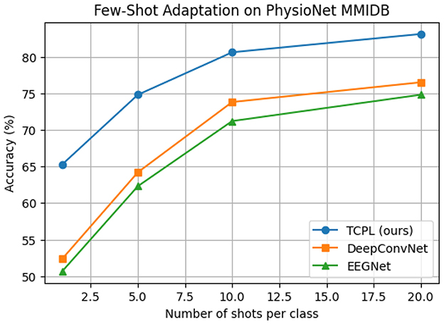 Figure 2. Few-shot cross-subject adaptation performance of TCPL, DeepConvNet, and EEGNet on the PhysioNet MMIDB dataset. Accuracy (%) is plotted against the number of calibration samples per class, showing that TCPL achieves superior performance with minimal training data.