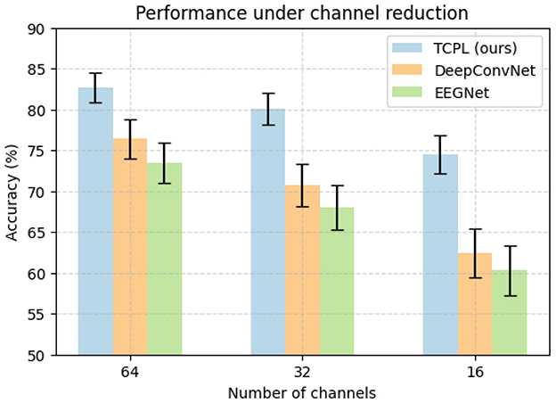 Figure 3. Performance comparison of TCPL, DeepConvNet, and EEGNet under channel reduction on the PhysioNet MMIDB dataset. Accuracy (%) is shown with error bars representing standard deviation across ten folds.