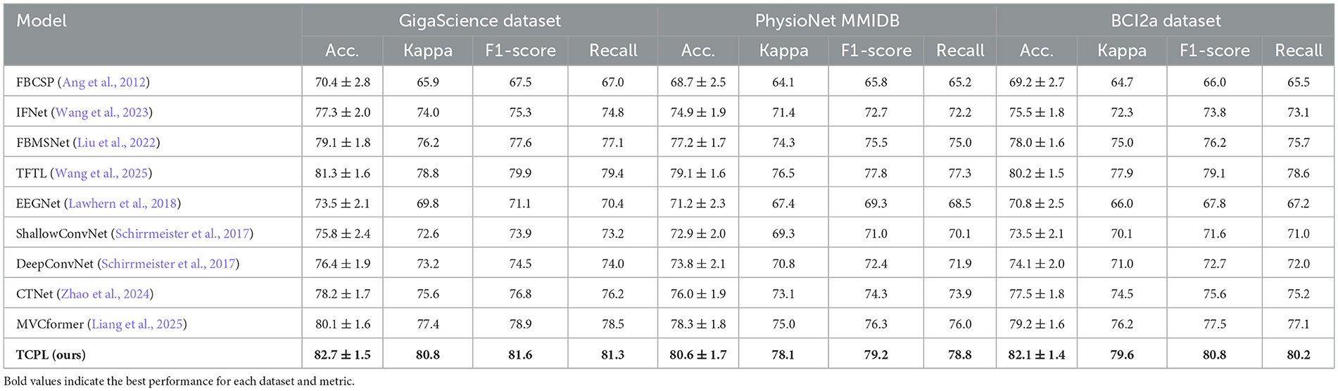 To comprehensively evaluate the effectiveness of TCPL, cross-subject experiments were conducted on the GigaScience MI dataset, PhysioNet MMIDB dataset, and BCI2a dataset, employing a ten-fold cross-validation protocol. Each fold was treated as an unseen subject, while the remaining folds were used for meta-training, simulating realistic BCI scenarios where new subjects provide only limited calibration data. Table 1 presents the mean classification accuracy and standard deviation across the ten folds for TCPL and representative baselines, including FBCSP (Ang et al., 2012), IFNet (Wang et al., 2023), FBMSNet (Liu et al., 2022), TFTL (Wang et al., 2025), EEGNet (Lawhern et al., 2018), ShallowConvNet (Schirrmeister et al., 2017), DeepConvNet (Schirrmeister et al., 2017), CTNet (Zhao et al., 2024), and MVCformer (Liang et al., 2025). To ensure statistical rigor, we additionally conducted paired t-tests between TCPL and the strongest baseline (MVCformer) for each dataset.