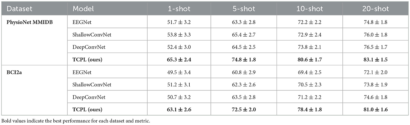 The results demonstrate that TCPL significantly outperforms all baselines under extremely limited calibration data. In the 1-shot scenario, TCPL achieves 65.3%, exceeding DeepConvNet by 12.9 points and EEGNet by 14.6 points. Even with only 5 shots, TCPL attains 74.8%, while baselines remain below 65%, reflecting the model's rapid adaptation capability. As the number of shots increases to 20, TCPL further improves to 83.1%, maintaining both high accuracy and low standard deviation, which demonstrates stable learning dynamics. These results indicate that TCPL can efficiently extract discriminative features from minimal data, a crucial property for practical BCI systems where extensive per-subject calibration is undesirable.