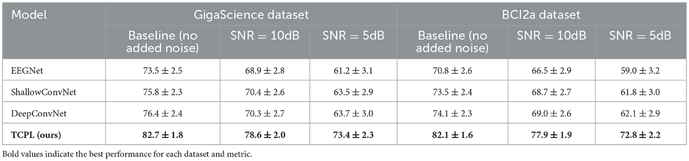 Table 3 presents the classification accuracy of TCPL and baseline models (EEGNet, ShallowConvNet, DeepConvNet) under different noise levels on the GigaScience dataset. TCPL achieves 82.7% accuracy with clean signals, and maintains 78.6% at SNR = 10 dB and 73.4% at SNR = 5 dB, significantly outperforming baselines, which suffer drops exceeding 10 points in low SNR conditions.