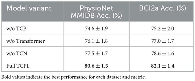 The ablation results confirm that TCPL's architecture is well-suited for real-world BCI applications. Each module addresses a distinct challenge in EEG decoding: TCP handles subject variability, TCN ensures local temporal fidelity, and Transformer models extended dependencies. This modular synergy ensures that TCPL can provide high accuracy, rapid adaptation, and robust stability, making it a promising candidate for deployment in real-time, cross-subject motor imagery BCI systems.