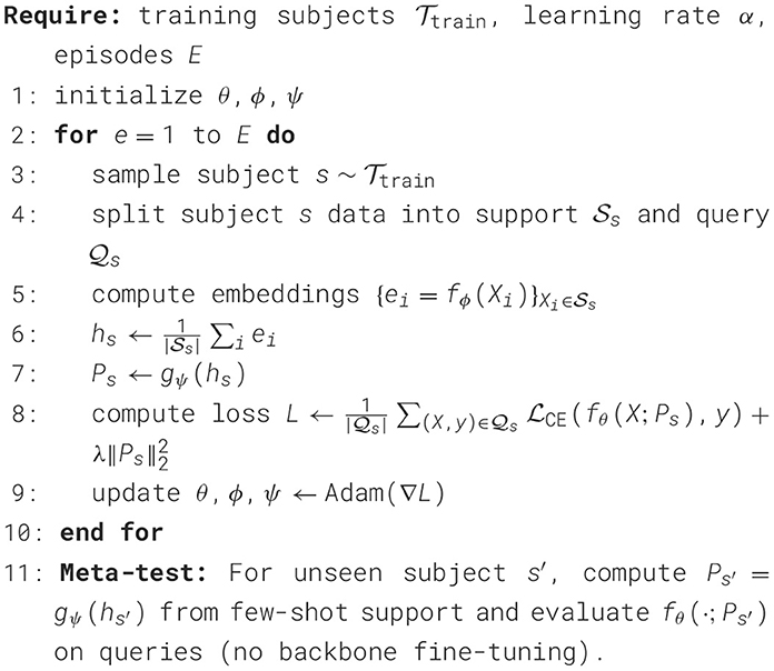 To enable few-shot cross-subject adaptation, we adopt a meta-learning strategy. For each subject-level task τ, we split data into a support set and query set . The meta-training objective is: