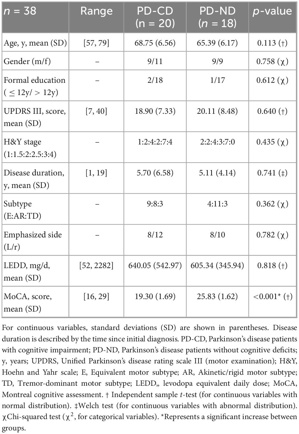 Patients were divided into two groups based on their MoCA scores. As shown by a meta-analysis, a MoCA cutoff score of 22 and below provides greater diagnostic accuracy (86%) than the originally suggested cut-off score of 26 (78%) (Carson et al., 2018). Therefore, patients with a MoCA score of 24 or above were allocated to the group of PD patients with no cognitive deficits (PD-ND), while those with a score between 21 and 16 were assigned to the group of PD patients with cognitive deficits (PD-CD).
