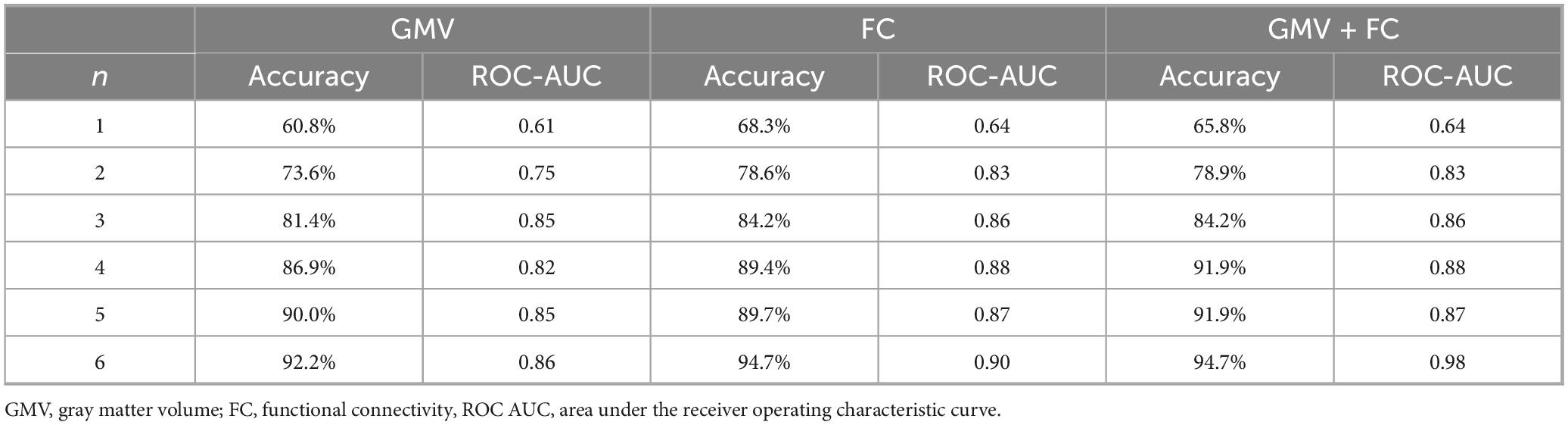 Table 4 lists the best-performing feature subsets and metrics for FC-based classification, ranging from 1 to 6 features. A single feature (DMN-2∼FP-4) gives an accuracy of 68.3%, which increases steadily as the number of features increases. The 6-feature model (DMN-3–VIS-2, FP-4–MOT-1, Age, DAN-2–DMN-1, DAN-2–FP-4, DMN-3–MOT-1) achieves the best performance with an accuracy of 94.7% and a ROC-AUC of 0.90, performing better than the GMV-only models.