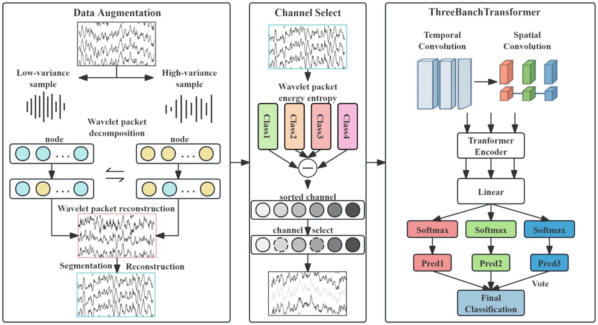 Methods: A three-stage pipeline is proposed. (1) Wavelet-packet decomposition (WPD) partitions each MI class into low-variance “stable” and high-variance “variant” trials; sub-band swapping between matched pairs generates synthetic trials that preserve event-related desynchronization/synchronization signatures. (2) Channel selection uses wavelet-packet energy entropy (WPEE) to quantify both spectral-energy complexity and class-separability; the top-ranked leads are retained. (3) A lightweight multi-branch network extracts multi-scale temporal features through parallel dilated convolutions, refines spatial patterns via depth-wise convolutions, and feeds the fused spatiotemporal tensor to a Transformer encoder with multi-head self-attention; soft-voted fully-connected layers deliver robust class labels.